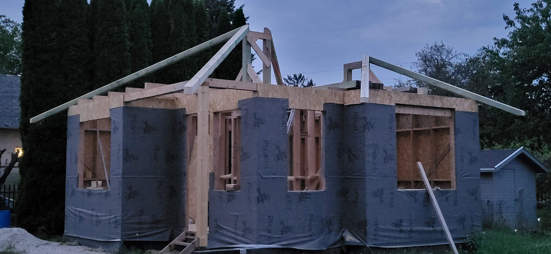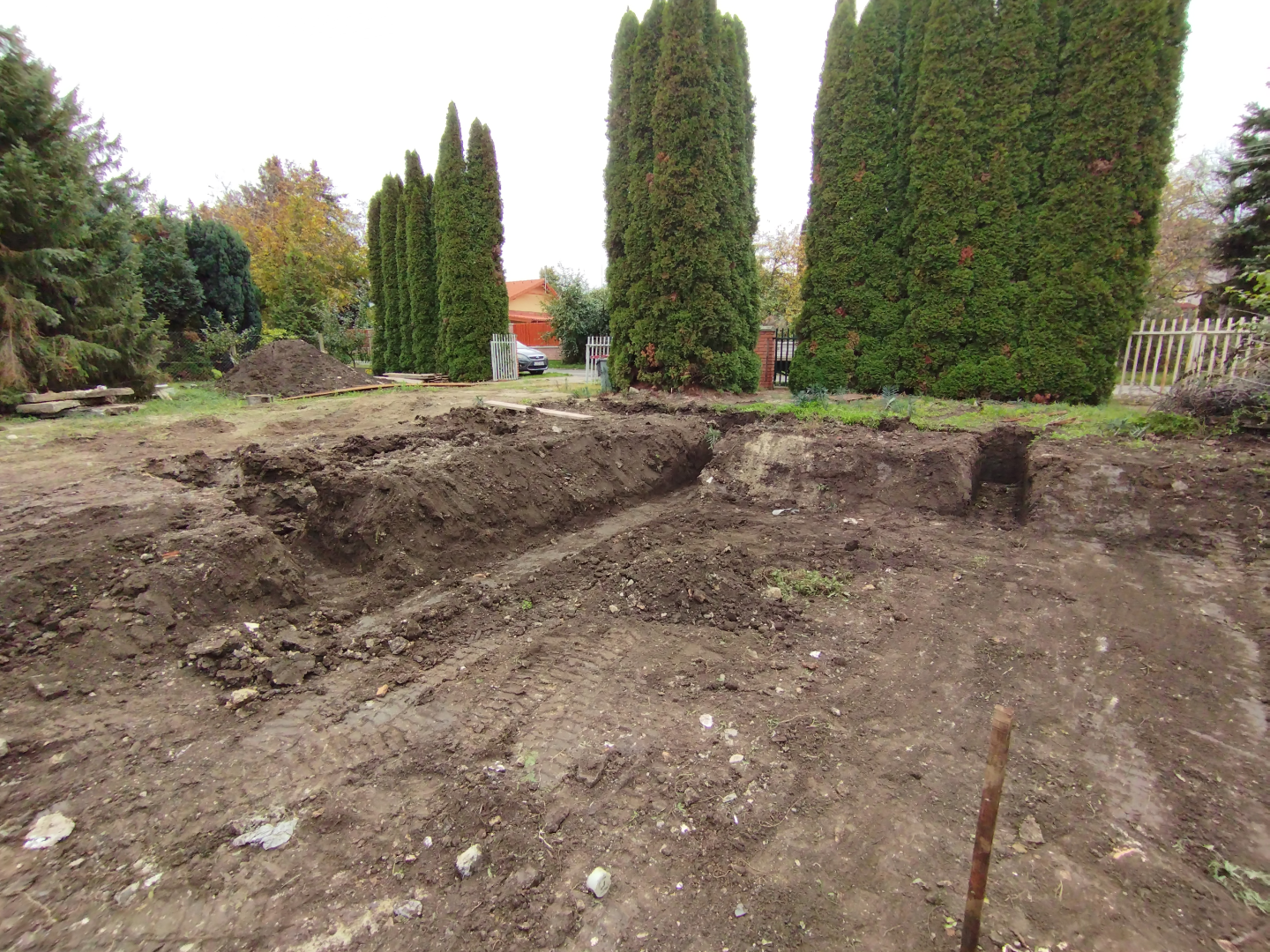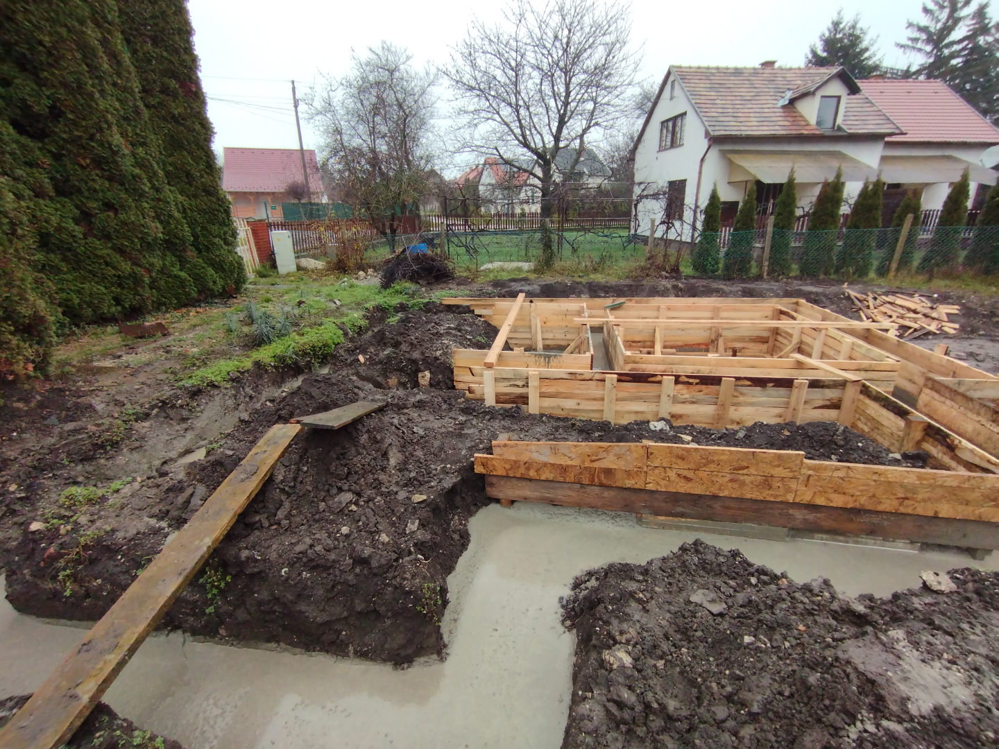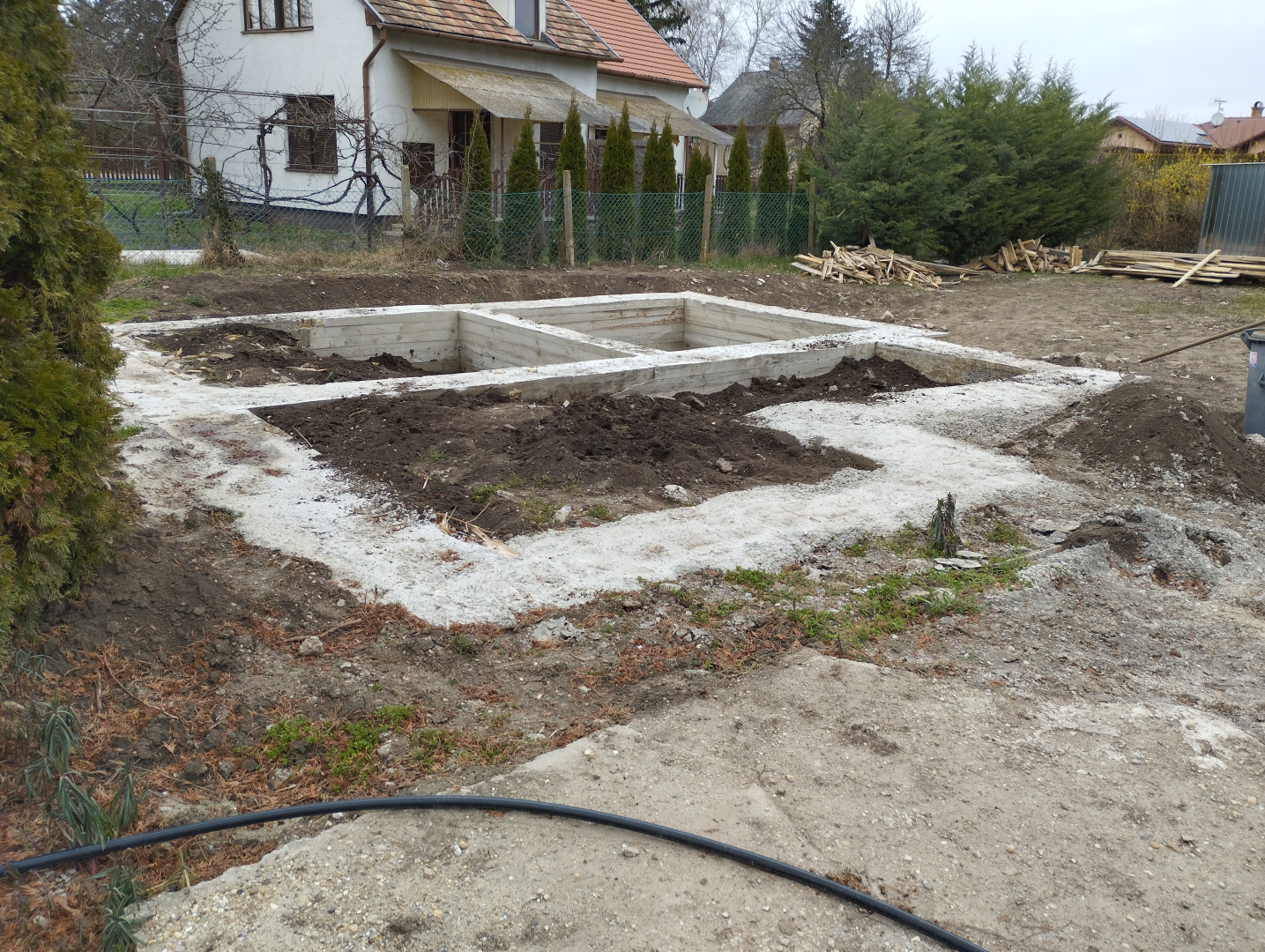 Építési kihívások: A munkálatok megkezdésekor rendelkezésünkre állt, egy korábbi kivitelező által készített beton alap. Első tervezett feladatunk a már elkészült alap kiegészítése volt. Mivel a korábban készült alapnál kisebb házat kért a megrendelő, így egy plusz sáv vált szükségessé. A bontási munkálatok megkezdésekor tapasztaltak alapján kértünk egy statikai szakvéleményt, amely megállapította, hogy a meglévő alap kivitelezése nem szakszerűen történt, javításra nincs mód, így sajnos azt el kell bontani. Az alap bontásakor került feltárásra a területen korábban állt ház alapteste, illetve egy pince is. A kitermelését követően egy méretes kráter alakult ki a területen. Annak érdekében, hogy az új alapot megfelelően tömörített földréteg támassza, úgy döntöttünk, hogy a sávalap egy részét zsaluzással készítjük el, és a száradást követően töltjük vissza, és tömörítjük a szükséges földet. A munkálatokról készült képek lent láthatóak.