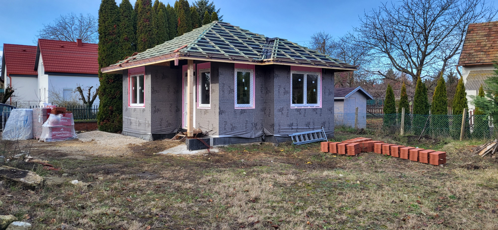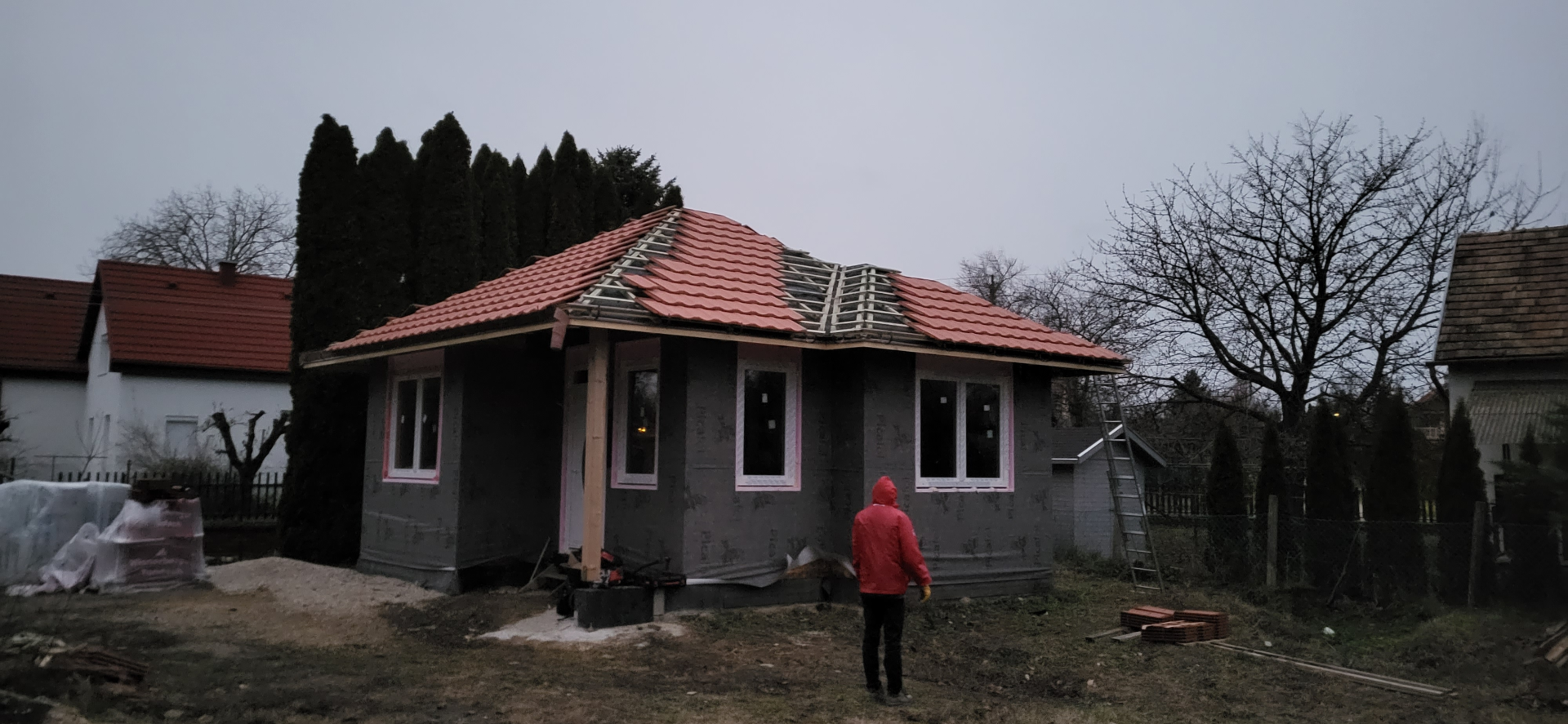 Balatonalmádiban (Aligán) jelenleg is építjük a képeken látható házat. Besorolása szerint lakóház, így minden jelenlegi energetikai, és egyéb követelménynek megfelel. Tulajdonosa nyaralóként szeretné használni. Beton alapozást kapott, 2 sor zsalukő kiemeléssel. Aljzat szigetelése 12 cm lépésálló EPS. Födéme 30, falai 15 cm szálas szigetelést kaptak+ 15 cm homlokzati EPS-t.