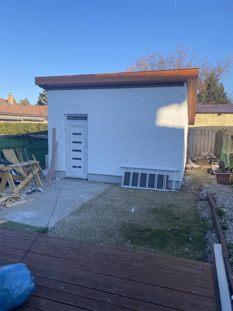 Pest vármegyében, Dunakeszin építettük ezt a hagyományos megjelenésű, féltetős melléképületet. A ház beton alapja már korábban elkészült, azzal nekünk - a vízszigetelés kivételével - nem volt feladatunk. Funkciója miatt belül a tér osztatlan, egyetlen nyílászárója a bejárati ajtó.