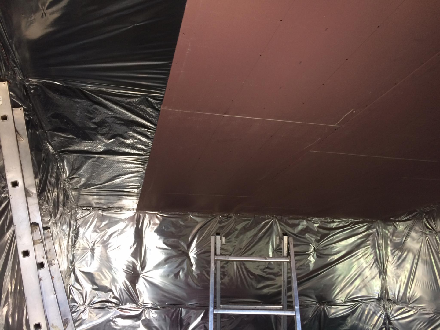 Egyedi megoldásai: Eresz,-és oromtúlnyúlása gyalult deszkával dobozolt. A nagy egybenyitott tér miatt, egy helyszínen készített rétegelt ragasztott tartógerenda viseli a tető súlyát. Funkciójából eredően fontos volt, hogy a külső fényeket, a lehető legnagyobb mértékben kizárjuk. Ennek érdekében fekete belső falakat kapott. Mennyezete ferde, a jobb akkusztikai hatás miatt. A helyiség hajópadló burkolatot kapott, amit fehér lazúrral kezeltünk. Rögzítése nem látszó.