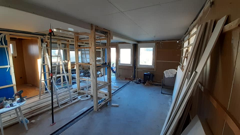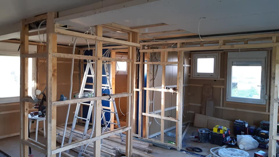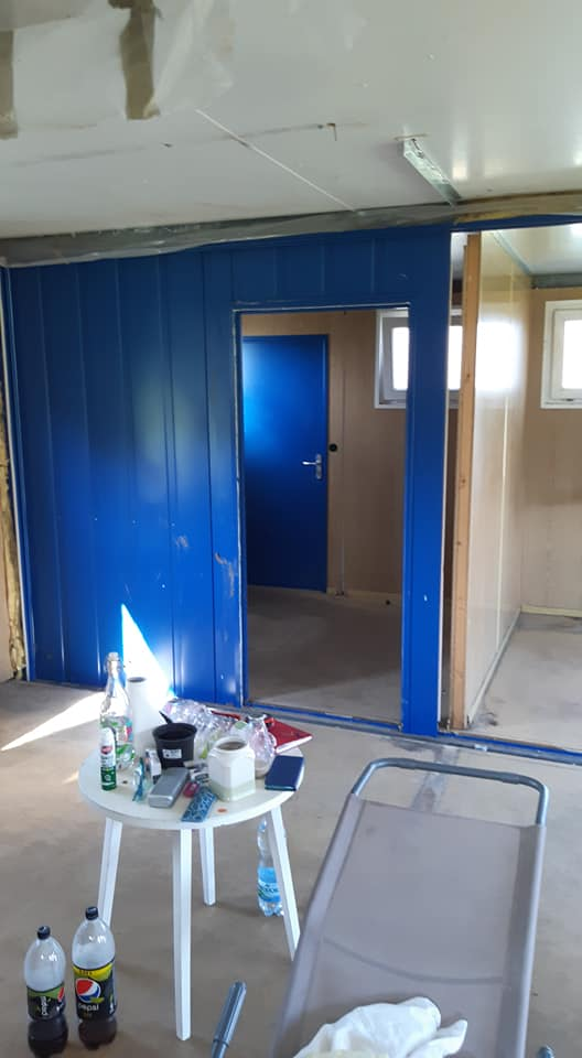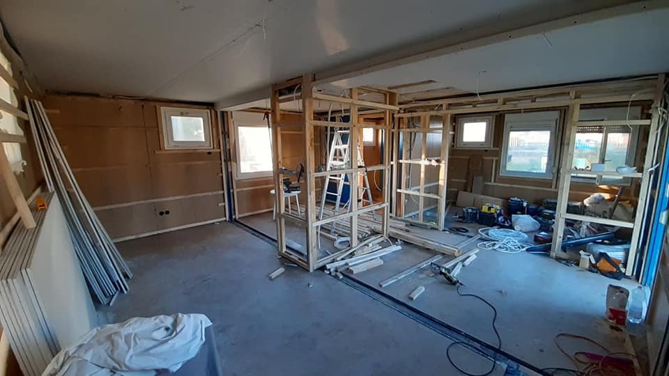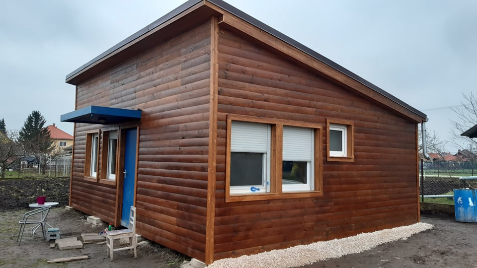 Pusztaszabolcson alakítottunk át 3 db irodakonténert, lakható házzá. Besorolása szerint melléképület, ez visszaköszön a relatíve alacsony építési költségben is. Az épület, megrendelőnk igénye szerint egy nagybb nappali-konyha-étkező térből, egy hálóból, és egy fürdőszobából áll. Szigetelése a konténerek gyári szigetelésén felül+10 cm kívül, és 20 cm a födémben. Fűtését és hűtését egy db hőszivattyús klíma biztosítja.