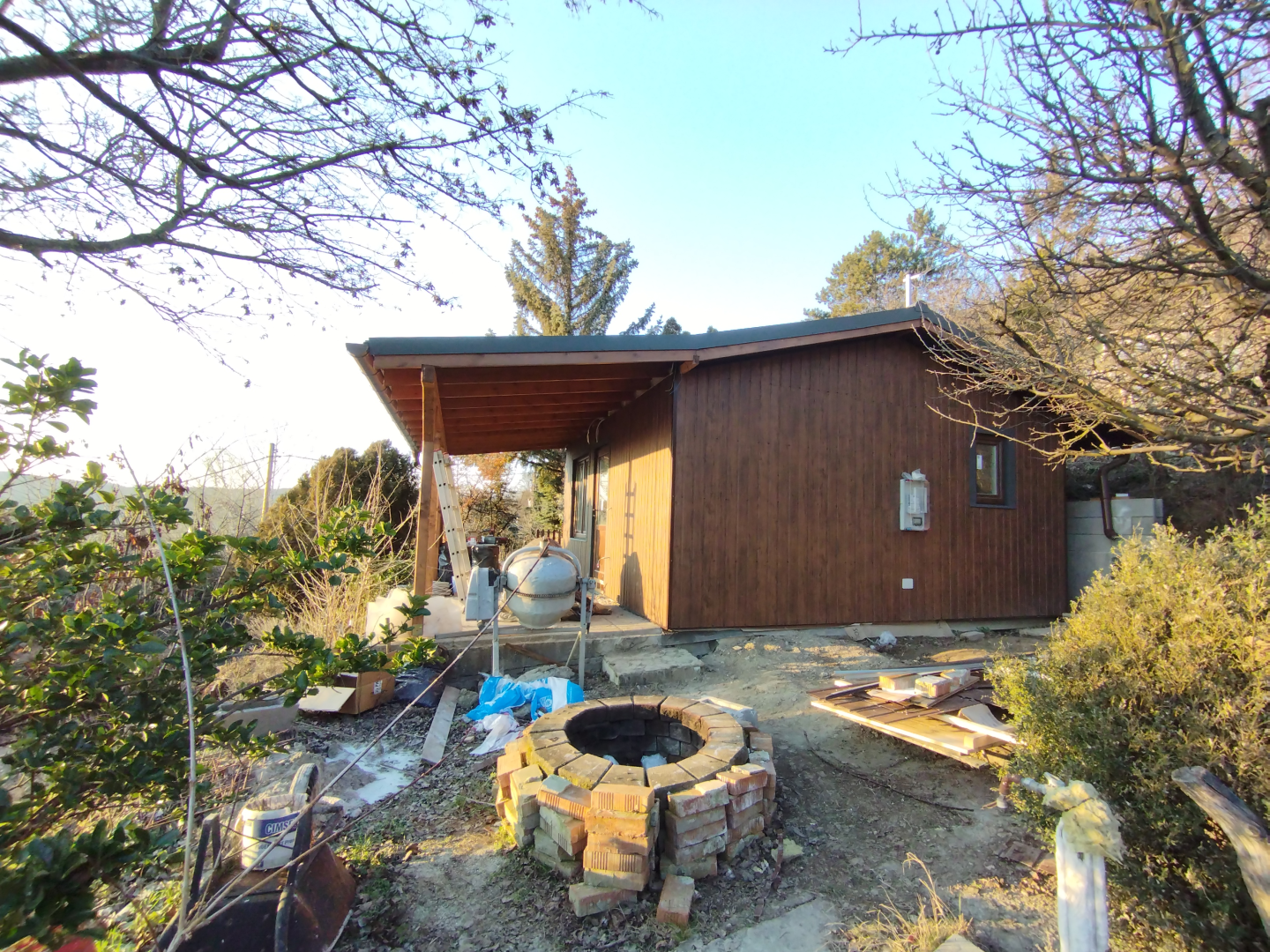Az épület, megrendelőnk igénye szerint egy nagy térből, és egy fürdőből áll. A gyönyörű panorámára nyíló, egyedi színben készült ablakok biztosítják a benapozottságot. Szigetelése 15 cm falszerkezeten belül+10 cm kívül. Fűtését fűtőpanel biztosítja. A lombos fák árnyékának köszönhetően hűtésre nincs szükség.