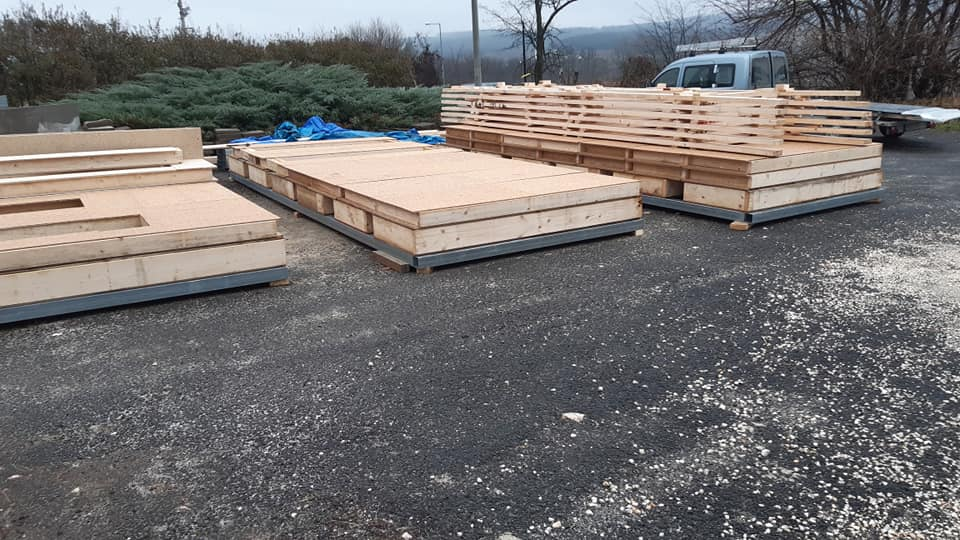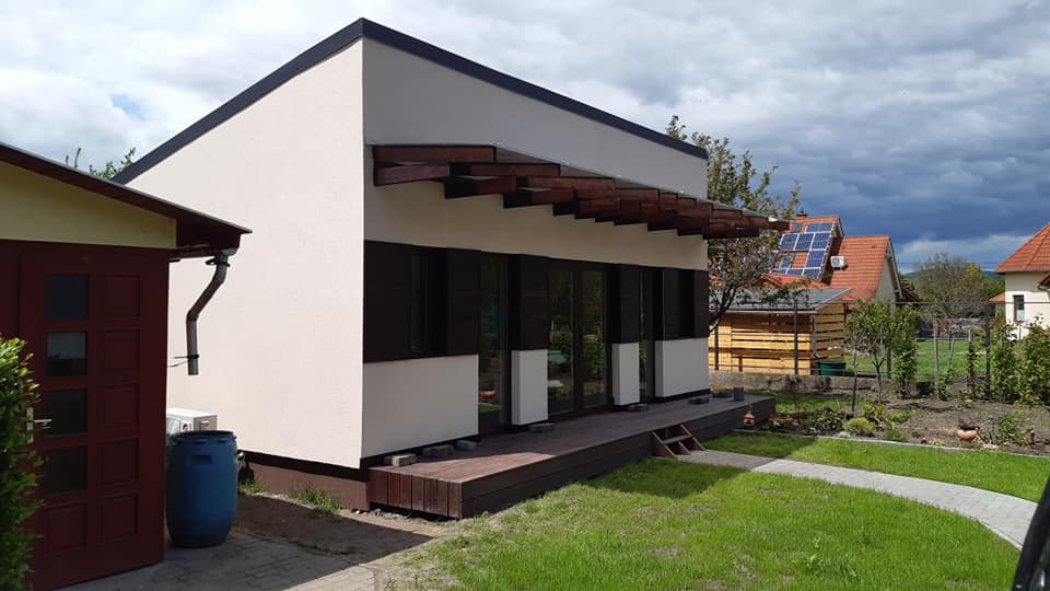 Egyedi megoldásai: A ház vázszerkezetét telephelyünkön készítettük el, majd teherautó szállította a helyszínre elemenként. A ház talajcsavarokra lett telepítve, horganyzott acél vázszerkezettel készült, előre gyártott pallóvázas fa szerkezettel. Tetőszerkezete rácsos tartós, födémgerendáinak túllógása képezi a függesztett teraszfedés tartóit. Cserepeslemez fedést kapott, csüngő ereszcsatornával.