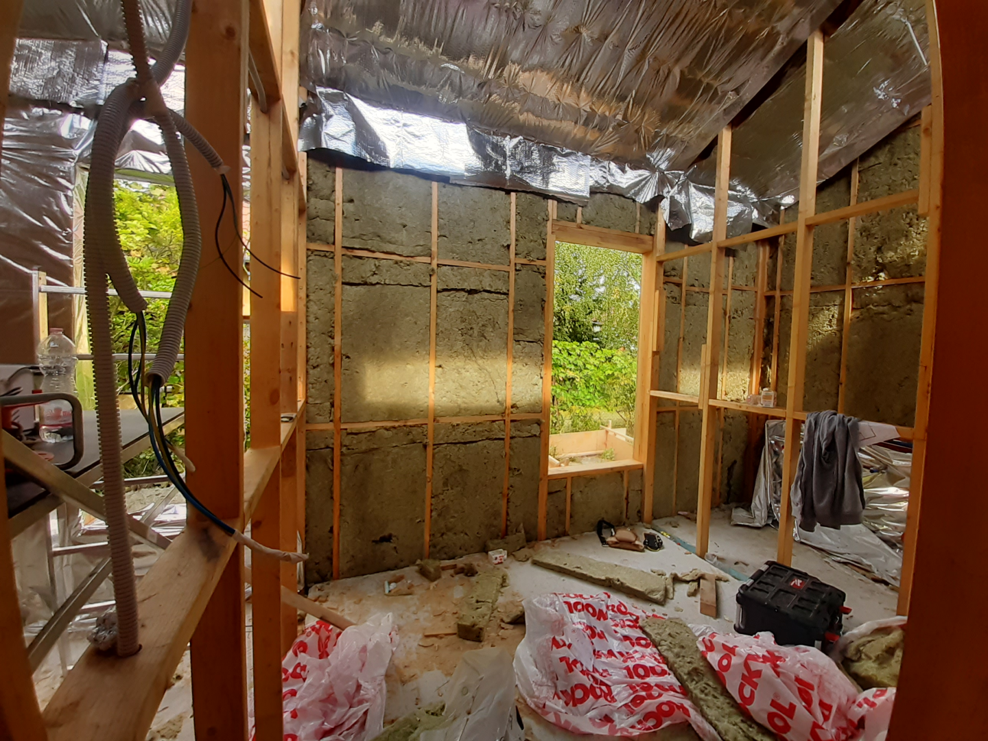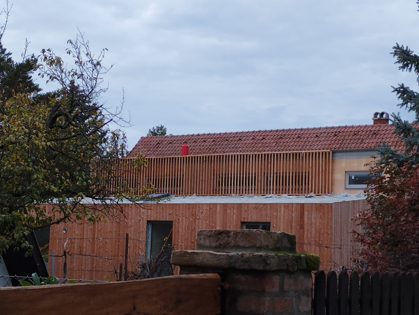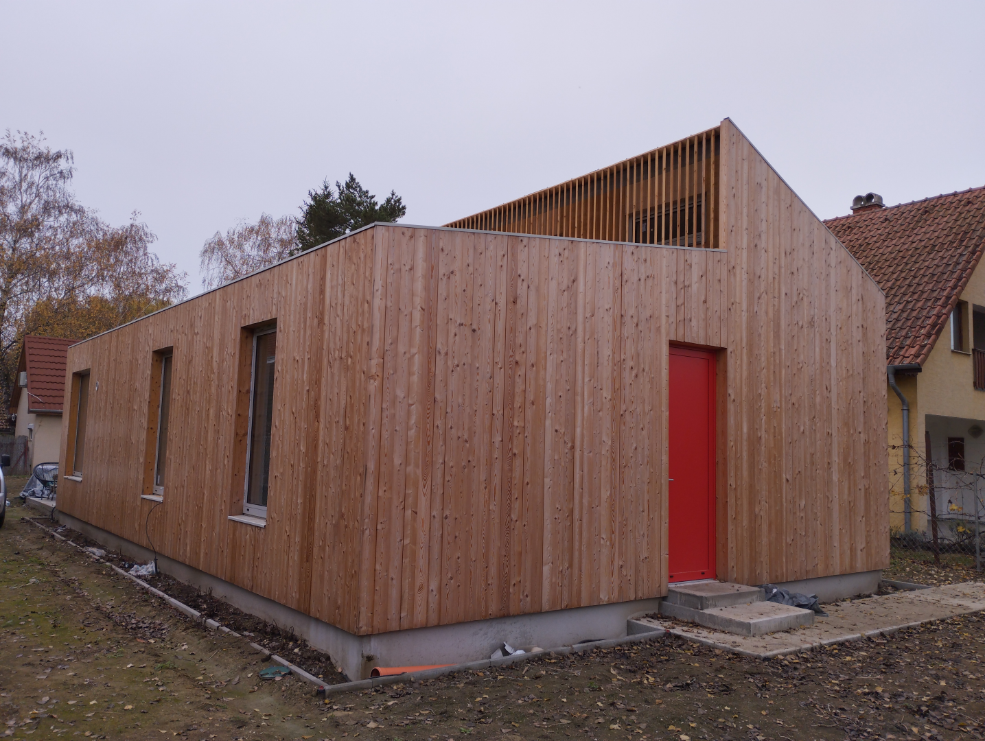 Belső terei gipszkarton falakat kaptak, fehér színben, míg homlokzati burkolata vörösfenyő. Egyedi színben és méretben készített, alumínium nyílászárókkal ellátott.