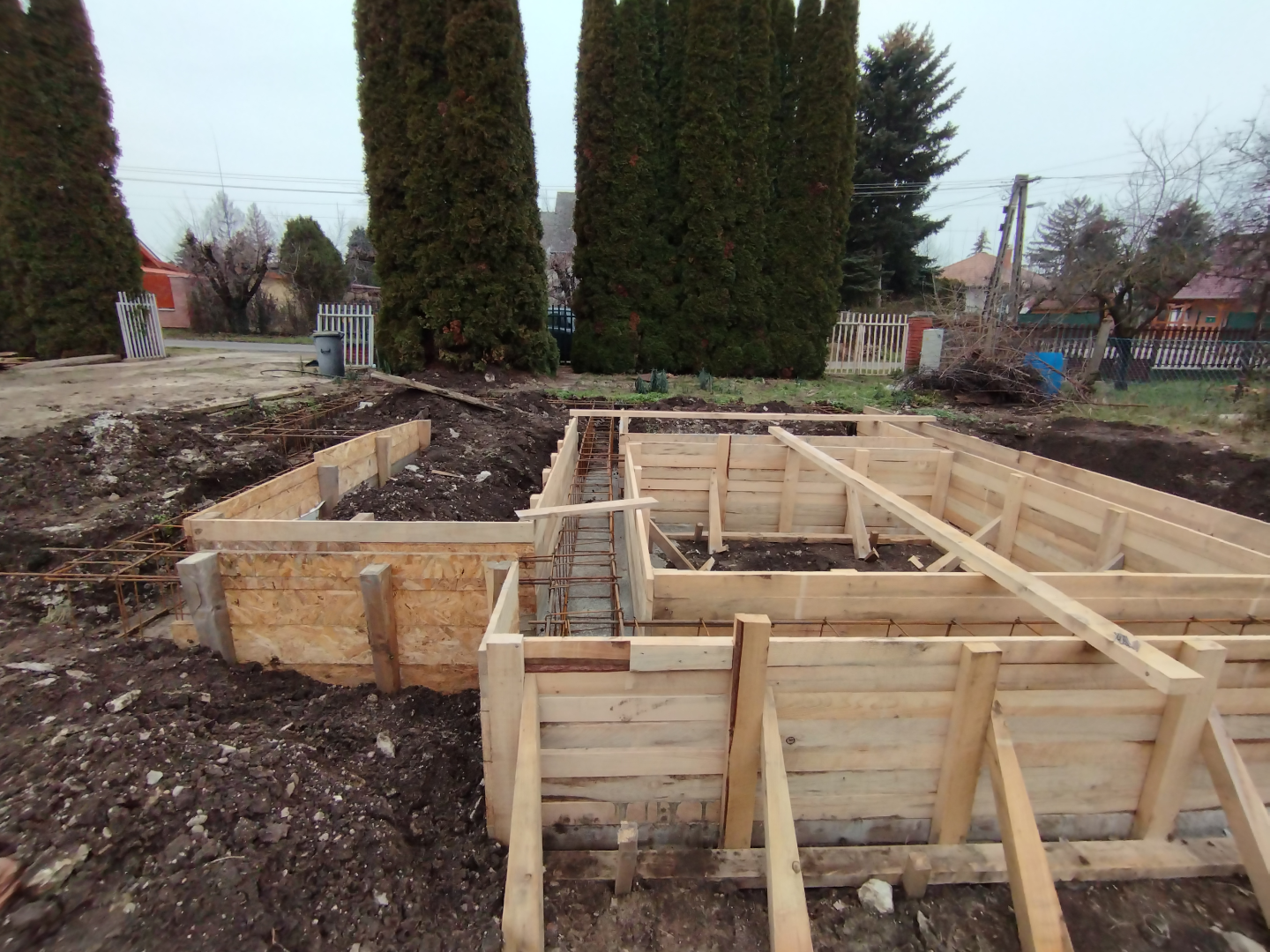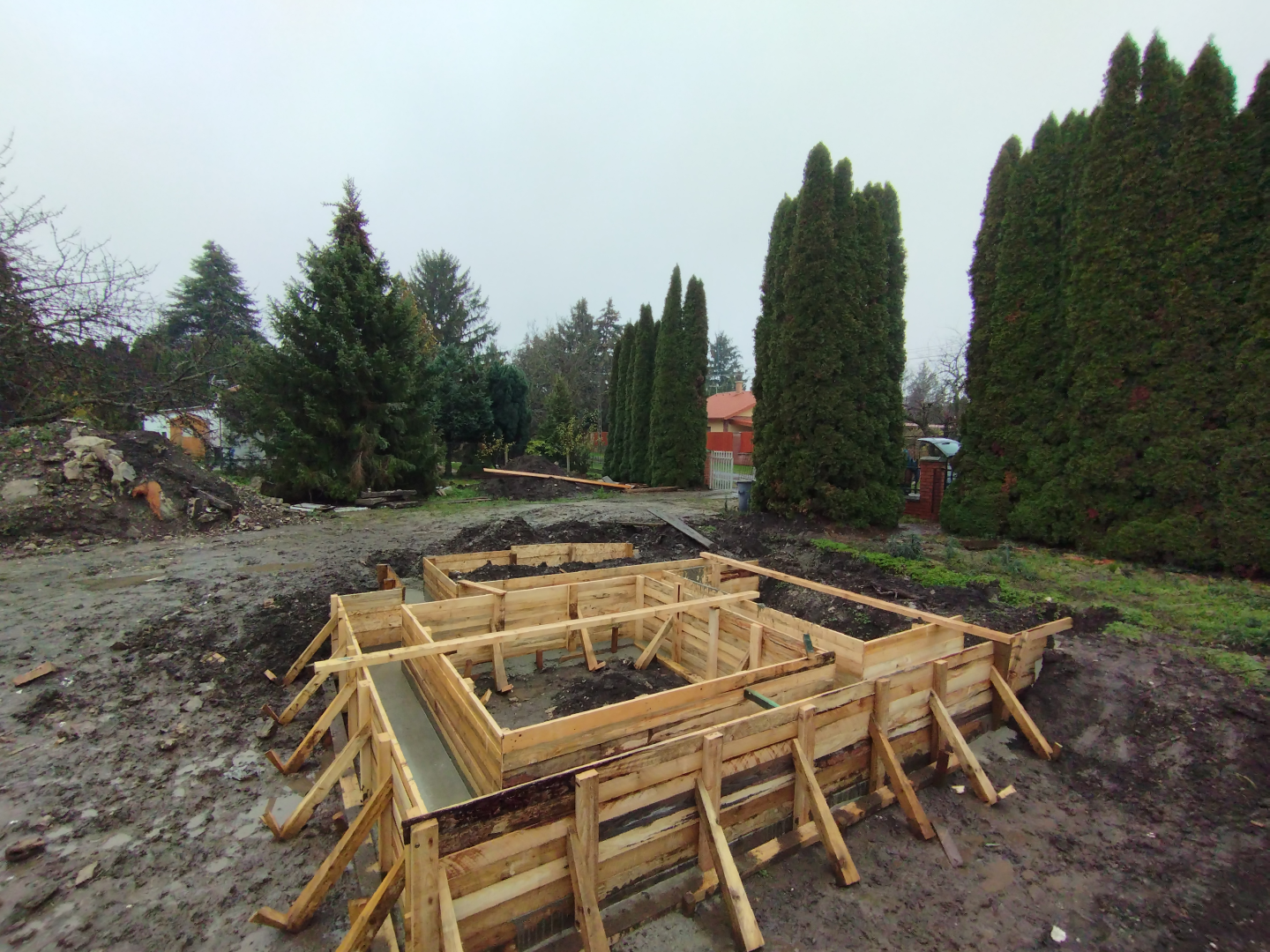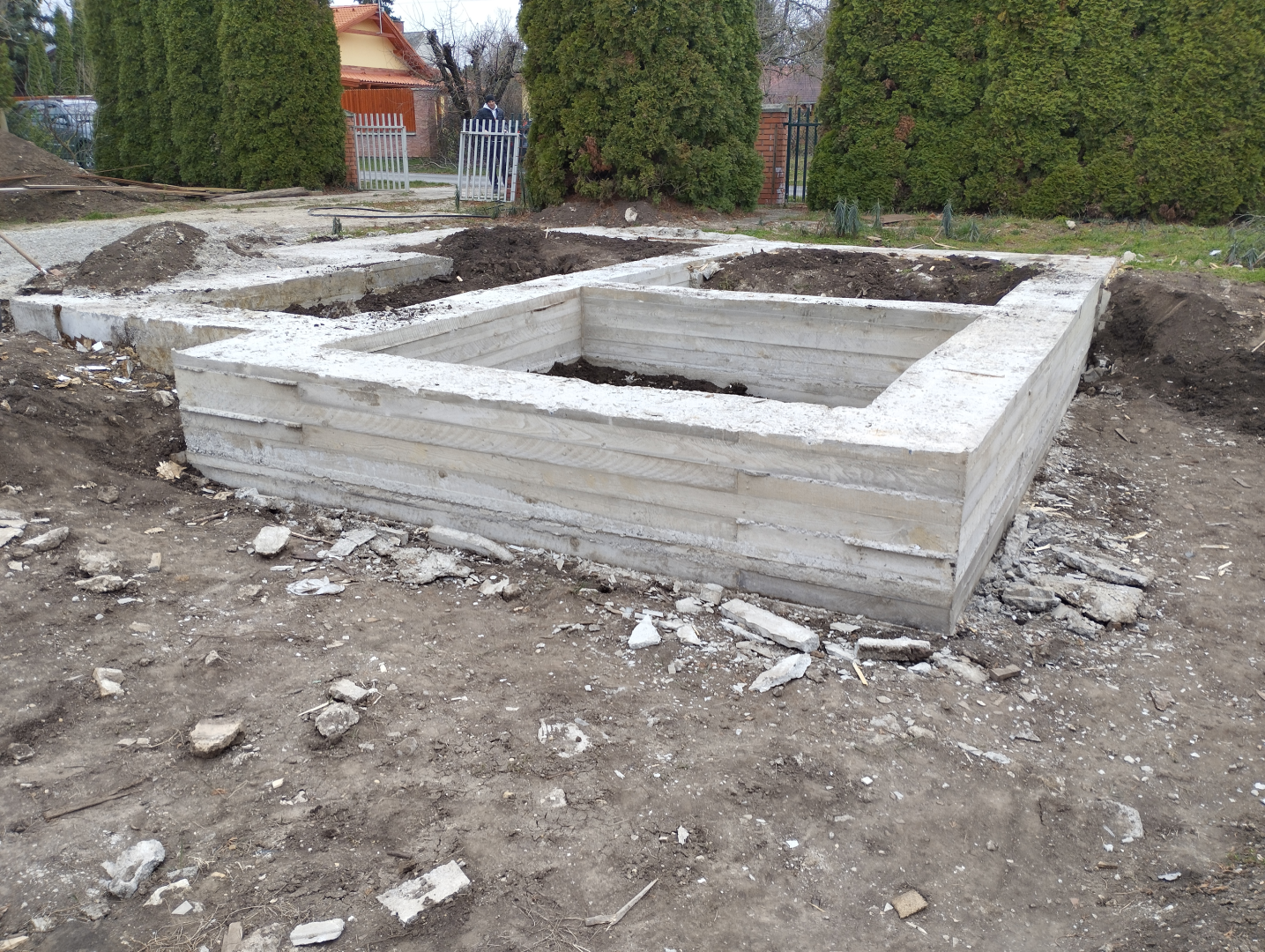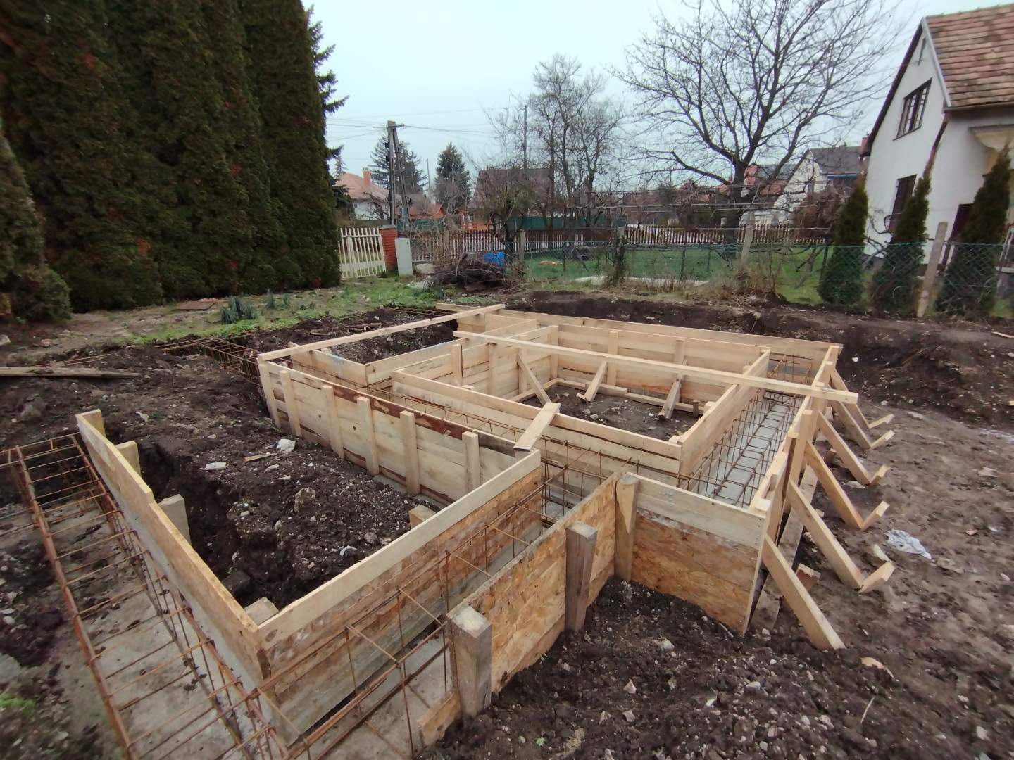 Építési kihívások: A munkálatok megkezdésekor rendelkezésünkre állt, egy korábbi kivitelező által készített beton alap. Első tervezett feladatunk a már elkészült alap kiegészítése volt. Mivel a korábban készült alapnál kisebb házat kért a megrendelő, így egy plusz sáv vált szükségessé. A bontási munkálatok megkezdésekor tapasztaltak alapján kértünk egy statikai szakvéleményt, amely megállapította, hogy a meglévő alap kivitelezése nem szakszerűen történt, javításra nincs mód, így sajnos azt el kell bontani. Az alap bontásakor került feltárásra a területen korábban állt ház alapteste, illetve egy pince is. A kitermelését követően egy méretes kráter alakult ki a területen. Annak érdekében, hogy az új alapot megfelelően tömörített földréteg támassza, úgy döntöttünk, hogy a sávalap egy részét zsaluzással készítjük el, és a száradást követően töltjük vissza, és tömörítjük a szükséges földet. A munkálatokról készült képek lent láthatóak.