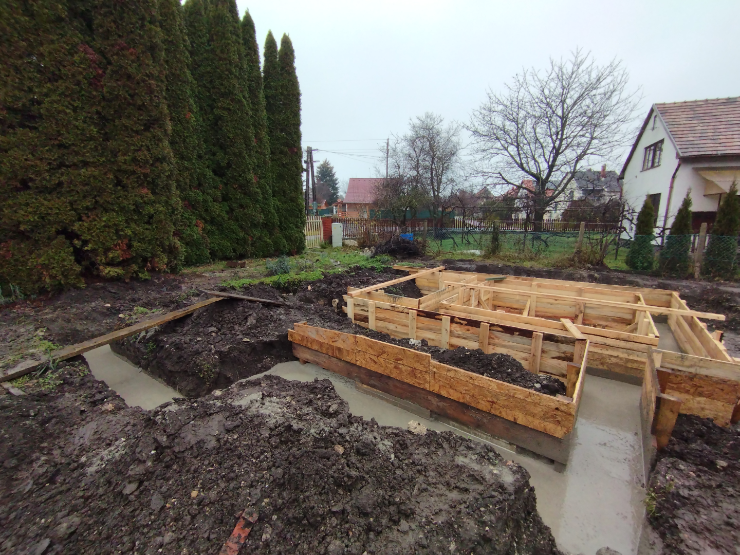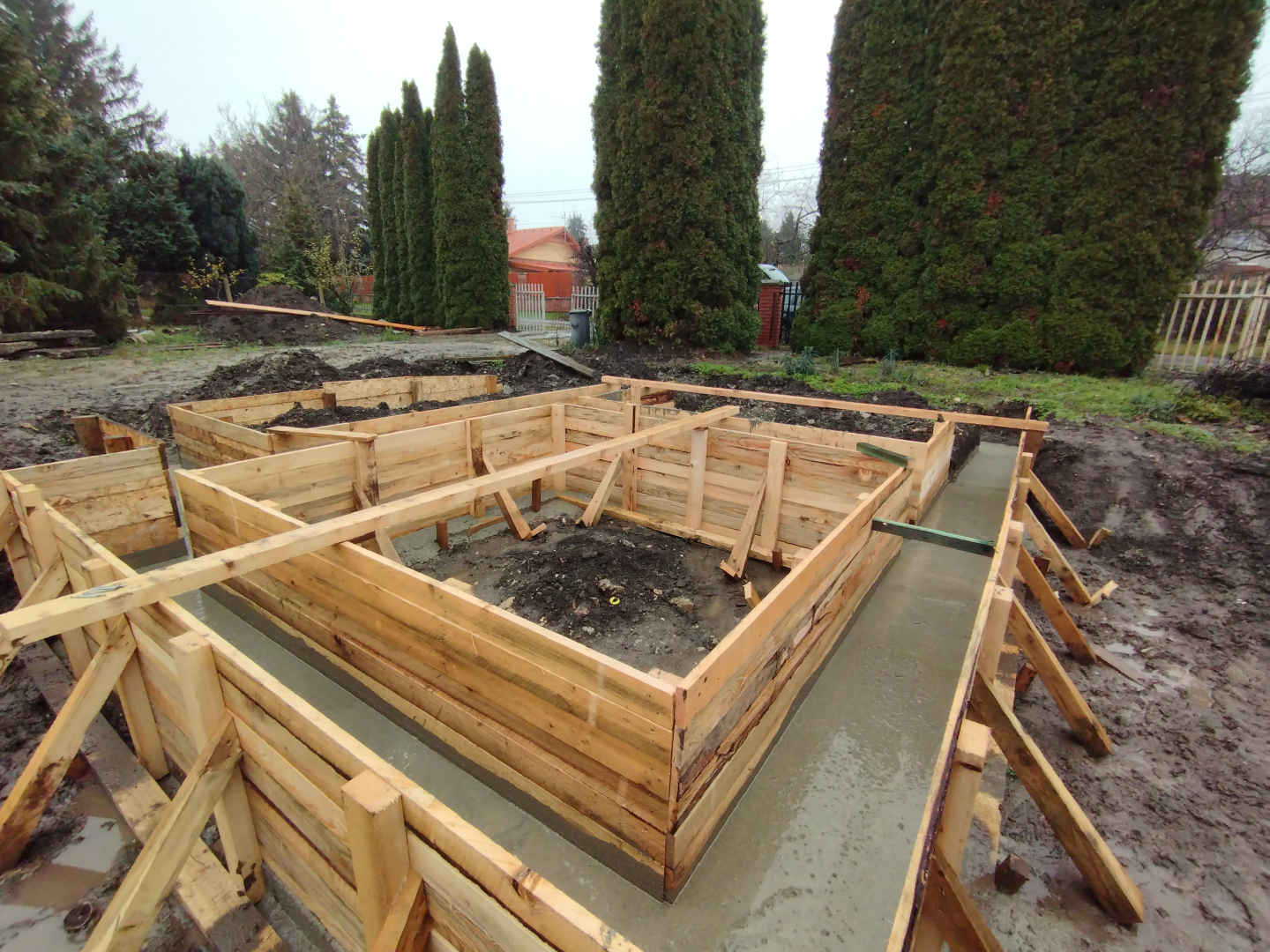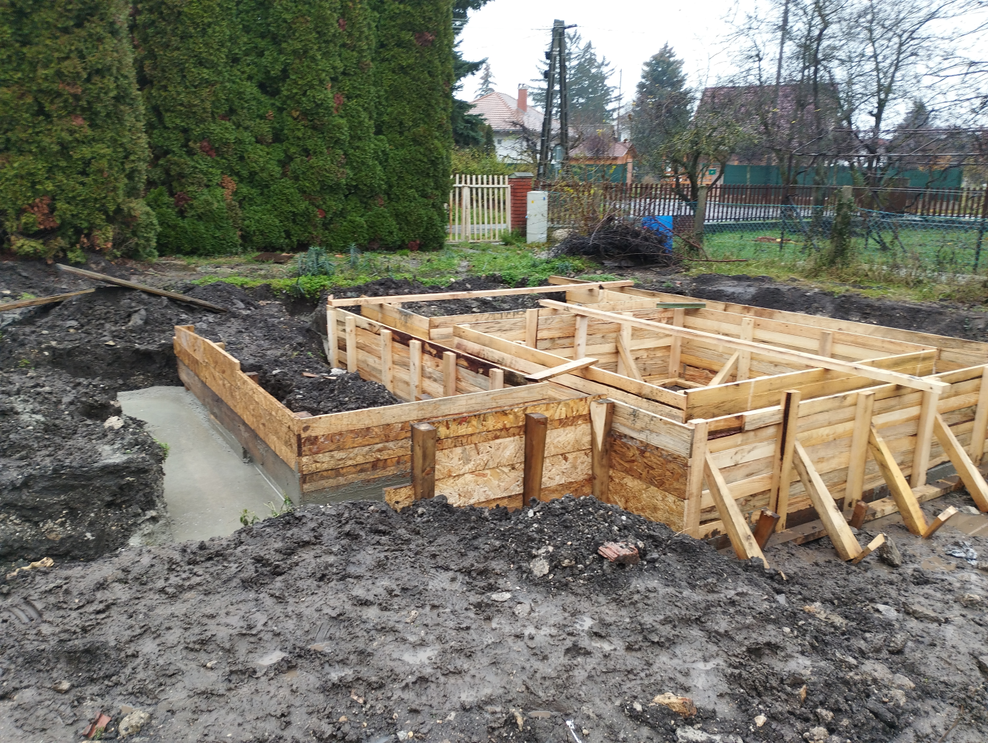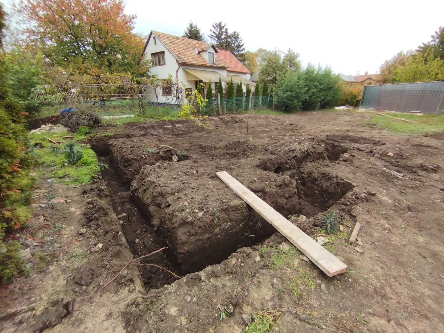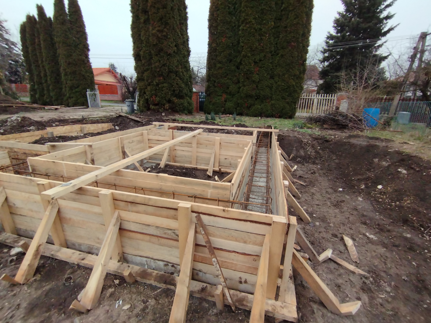 Építési kihívások: A munkálatok megkezdésekor rendelkezésünkre állt, egy korábbi kivitelező által készített beton alap. Első tervezett feladatunk a már elkészült alap kiegészítése volt. Mivel a korábban készült alapnál kisebb házat kért a megrendelő, így egy plusz sáv vált szükségessé. A bontási munkálatok megkezdésekor tapasztaltak alapján kértünk egy statikai szakvéleményt, amely megállapította, hogy a meglévő alap kivitelezése nem szakszerűen történt, javításra nincs mód, így sajnos azt el kell bontani. Az alap bontásakor került feltárásra a területen korábban állt ház alapteste, illetve egy pince is. A kitermelését követően egy méretes kráter alakult ki a területen. Annak érdekében, hogy az új alapot megfelelően tömörített földréteg támassza, úgy döntöttünk, hogy a sávalap egy részét zsaluzással készítjük el, és a száradást követően töltjük vissza, és tömörítjük a szükséges földet. A munkálatokról készült képek lent láthatóak.