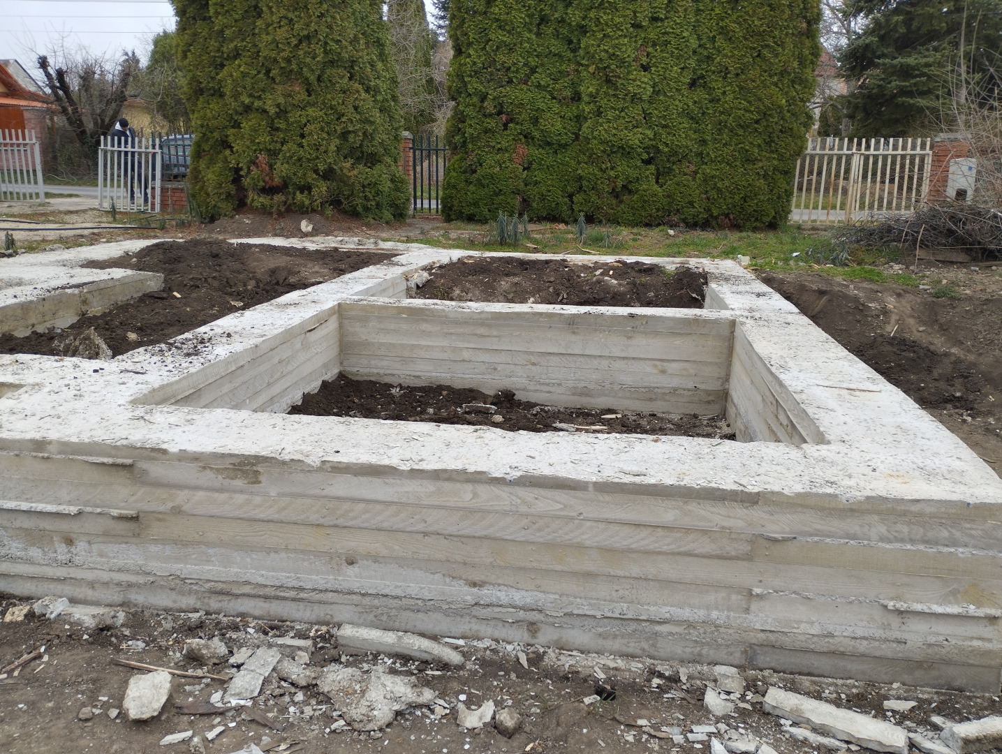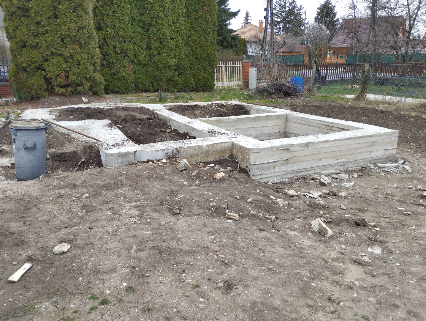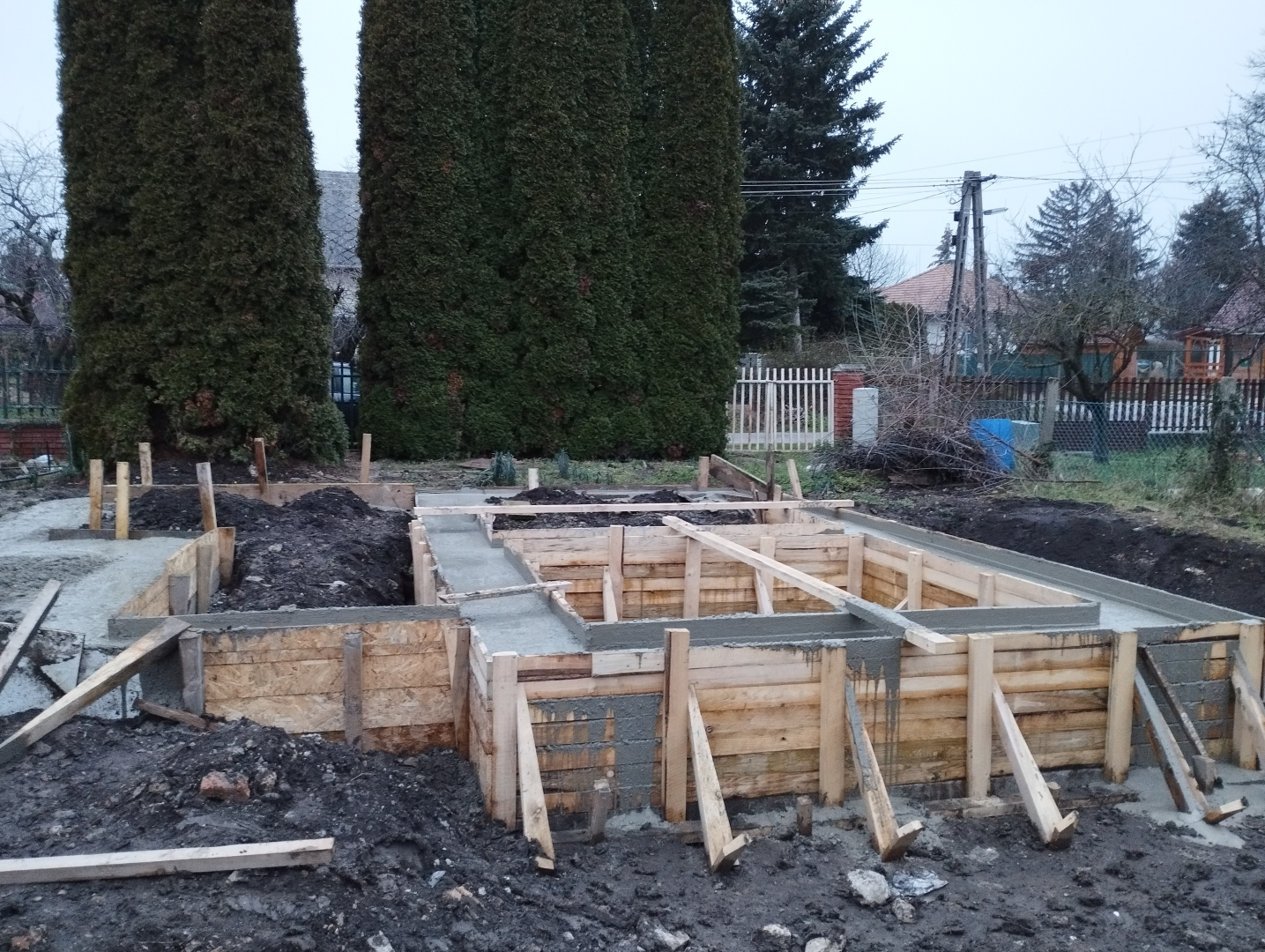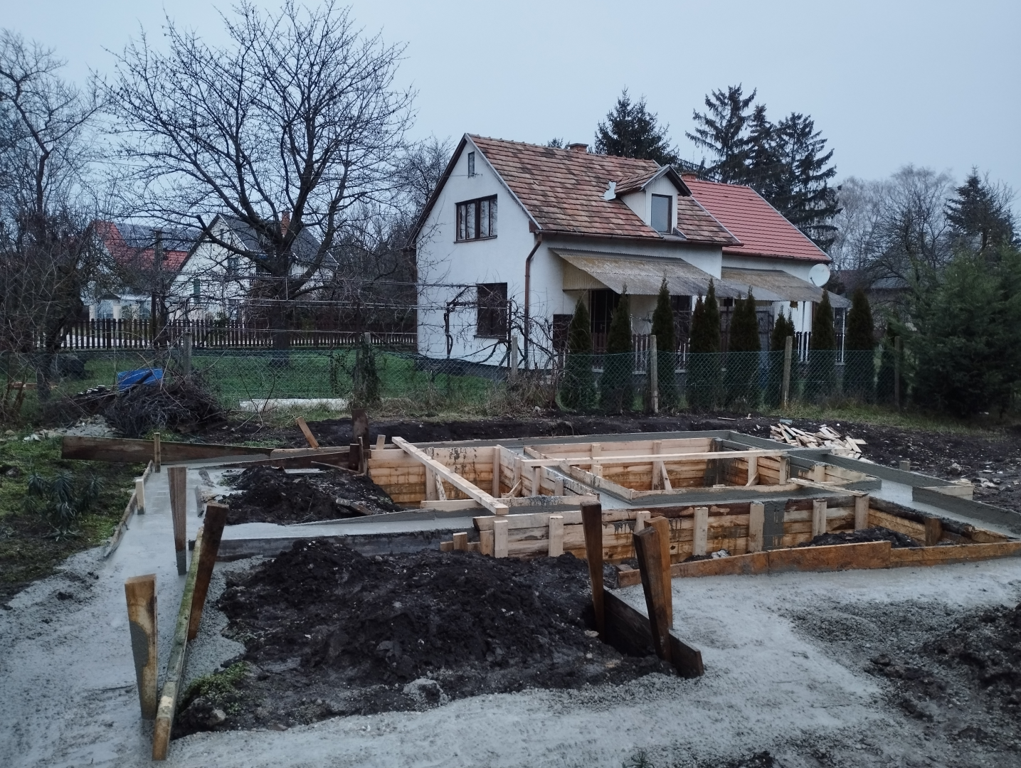Építési kihívások: A munkálatok megkezdésekor rendelkezésünkre állt, egy korábbi kivitelező által készített beton alap. Első tervezett feladatunk a már elkészült alap kiegészítése volt. Mivel a korábban készült alapnál kisebb házat kért a megrendelő, így egy plusz sáv vált szükségessé. A bontási munkálatok megkezdésekor tapasztaltak alapján kértünk egy statikai szakvéleményt, amely megállapította, hogy a meglévő alap kivitelezése nem szakszerűen történt, javításra nincs mód, így sajnos azt el kell bontani. Az alap bontásakor került feltárásra a területen korábban állt ház alapteste, illetve egy pince is. A kitermelését követően egy méretes kráter alakult ki a területen. Annak érdekében, hogy az új alapot megfelelően tömörített földréteg támassza, úgy döntöttünk, hogy a sávalap egy részét zsaluzással készítjük el, és a száradást követően töltjük vissza, és tömörítjük a szükséges földet. A munkálatokról készült képek lent láthatóak.