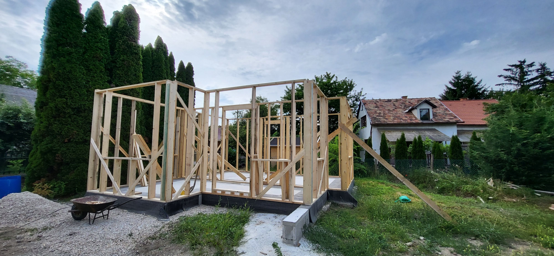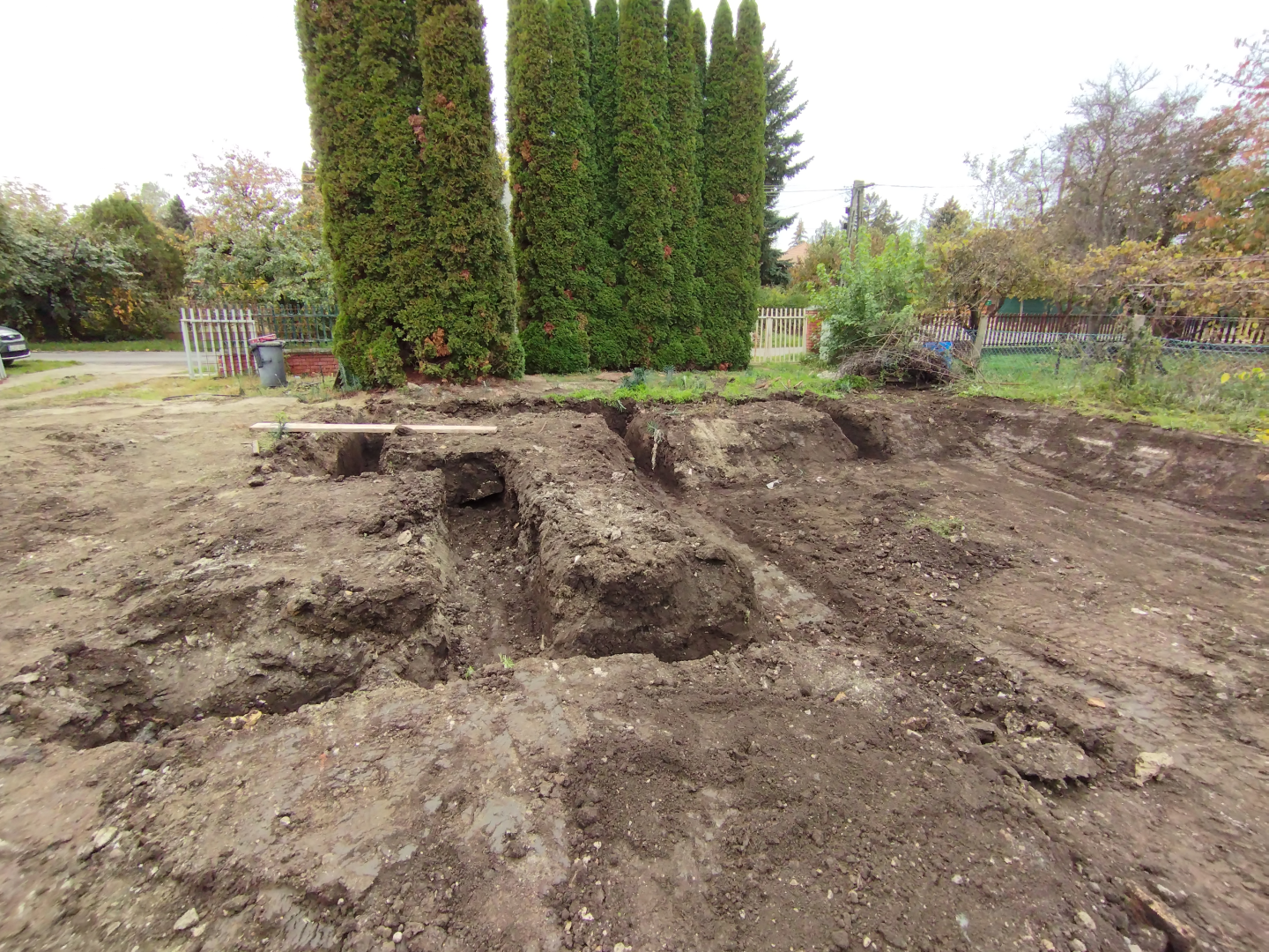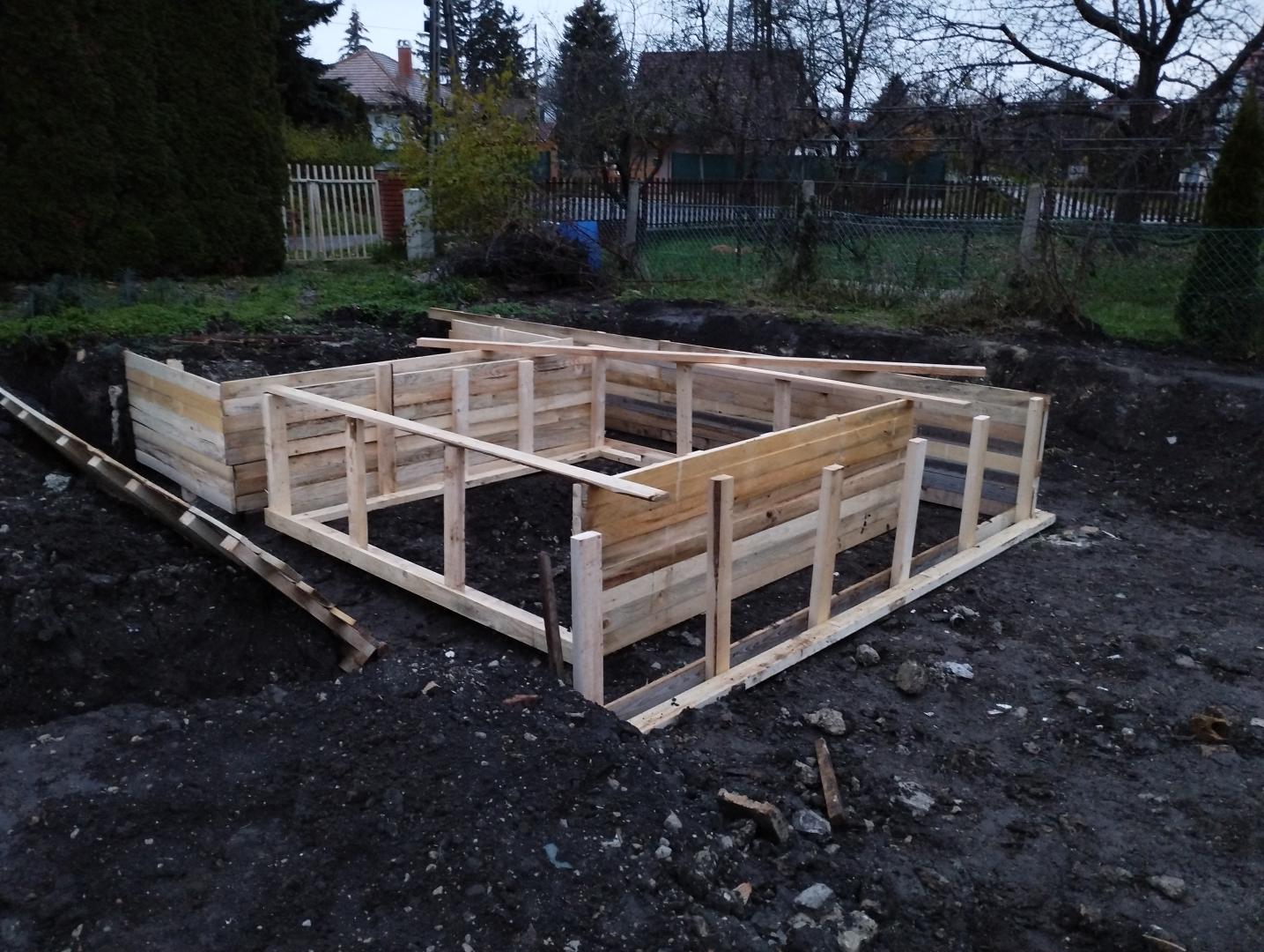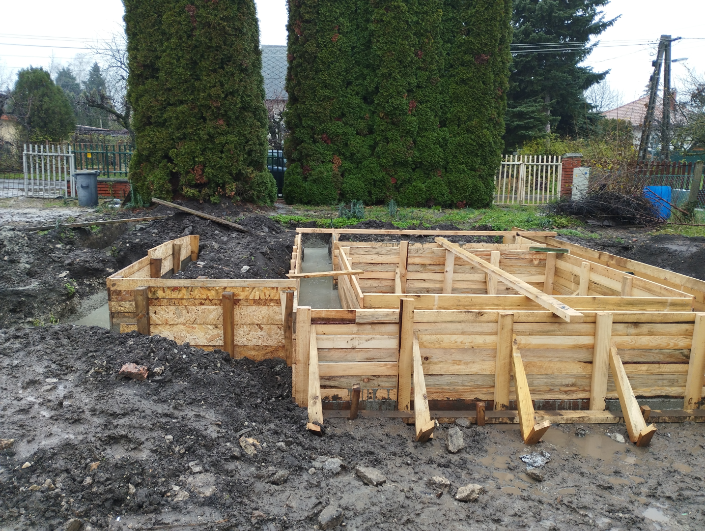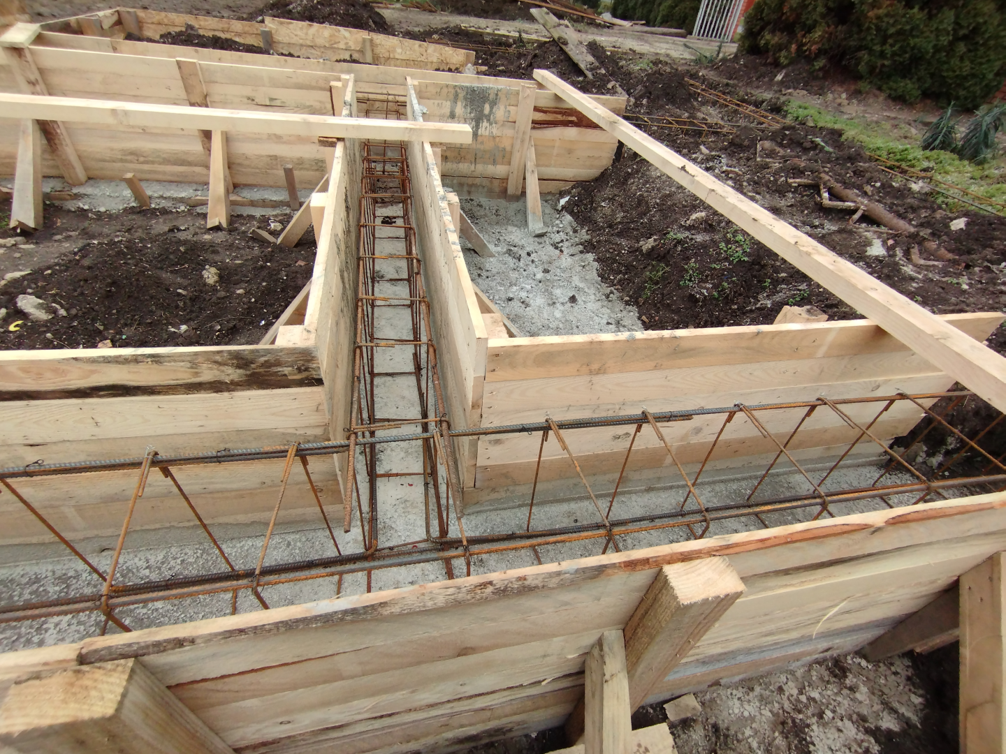 Építési kihívások: A munkálatok megkezdésekor rendelkezésünkre állt, egy korábbi kivitelező által készített beton alap. Első tervezett feladatunk a már elkészült alap kiegészítése volt. Mivel a korábban készült alapnál kisebb házat kért a megrendelő, így egy plusz sáv vált szükségessé. A bontási munkálatok megkezdésekor tapasztaltak alapján kértünk egy statikai szakvéleményt, amely megállapította, hogy a meglévő alap kivitelezése nem szakszerűen történt, javításra nincs mód, így sajnos azt el kell bontani. Az alap bontásakor került feltárásra a területen korábban állt ház alapteste, illetve egy pince is. A kitermelését követően egy méretes kráter alakult ki a területen. Annak érdekében, hogy az új alapot megfelelően tömörített földréteg támassza, úgy döntöttünk, hogy a sávalap egy részét zsaluzással készítjük el, és a száradást követően töltjük vissza, és tömörítjük a szükséges földet. A munkálatokról készült képek lent láthatóak.