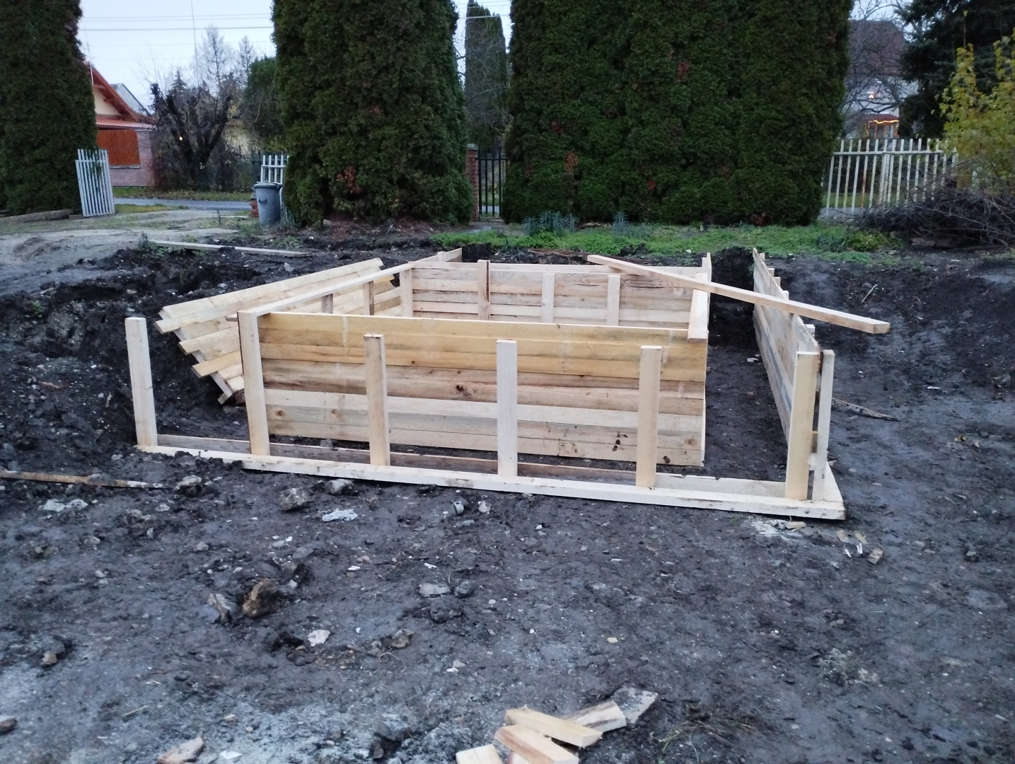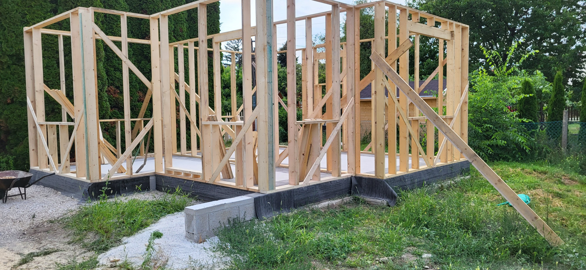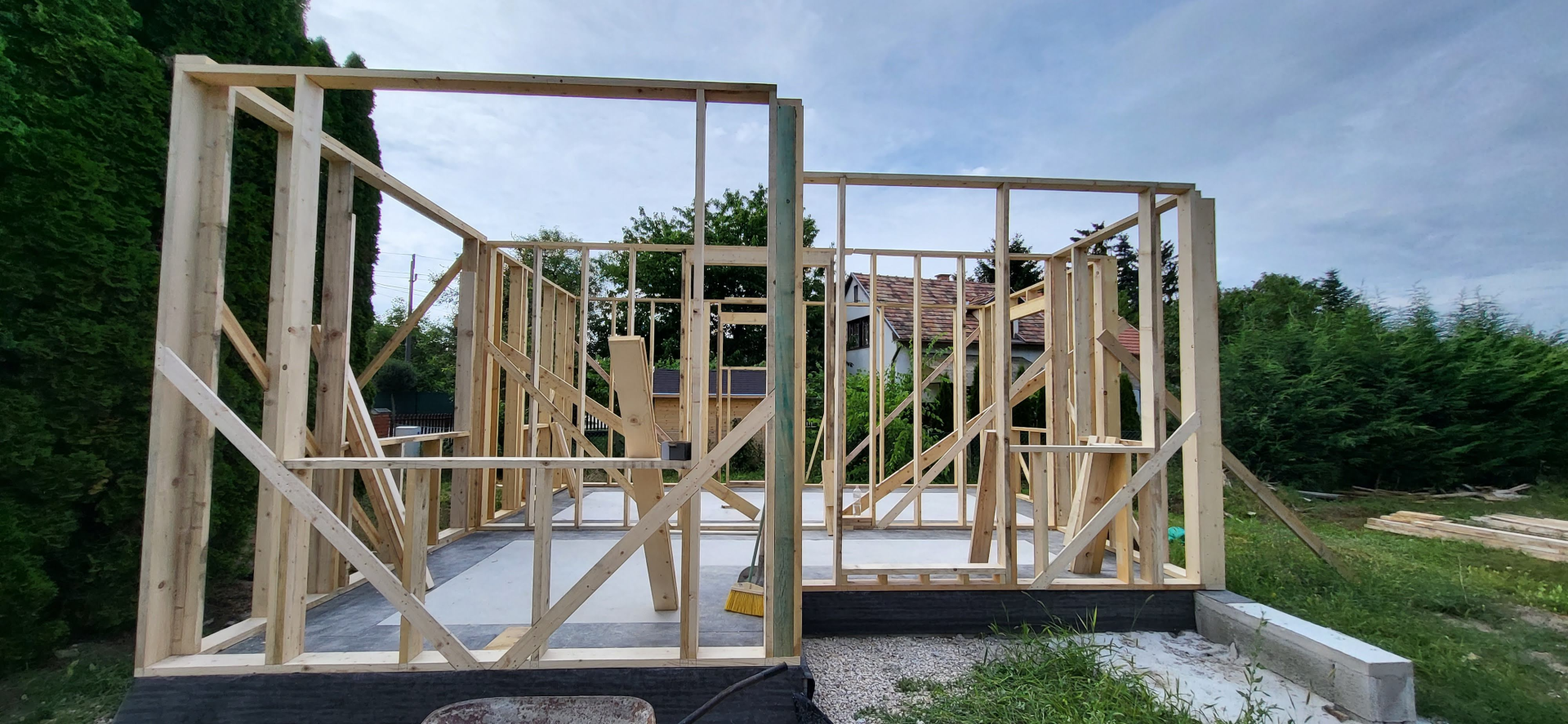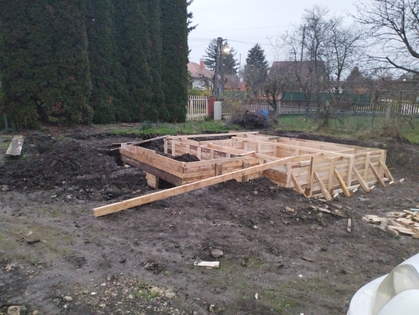 Építési kihívások: A munkálatok megkezdésekor rendelkezésünkre állt, egy korábbi kivitelező által készített beton alap. Első tervezett feladatunk a már elkészült alap kiegészítése volt. Mivel a korábban készült alapnál kisebb házat kért a megrendelő, így egy plusz sáv vált szükségessé. A bontási munkálatok megkezdésekor tapasztaltak alapján kértünk egy statikai szakvéleményt, amely megállapította, hogy a meglévő alap kivitelezése nem szakszerűen történt, javításra nincs mód, így sajnos azt el kell bontani. Az alap bontásakor került feltárásra a területen korábban állt ház alapteste, illetve egy pince is. A kitermelését követően egy méretes kráter alakult ki a területen. Annak érdekében, hogy az új alapot megfelelően tömörített földréteg támassza, úgy döntöttünk, hogy a sávalap egy részét zsaluzással készítjük el, és a száradást követően töltjük vissza, és tömörítjük a szükséges földet. A munkálatokról készült képek lent láthatóak.
