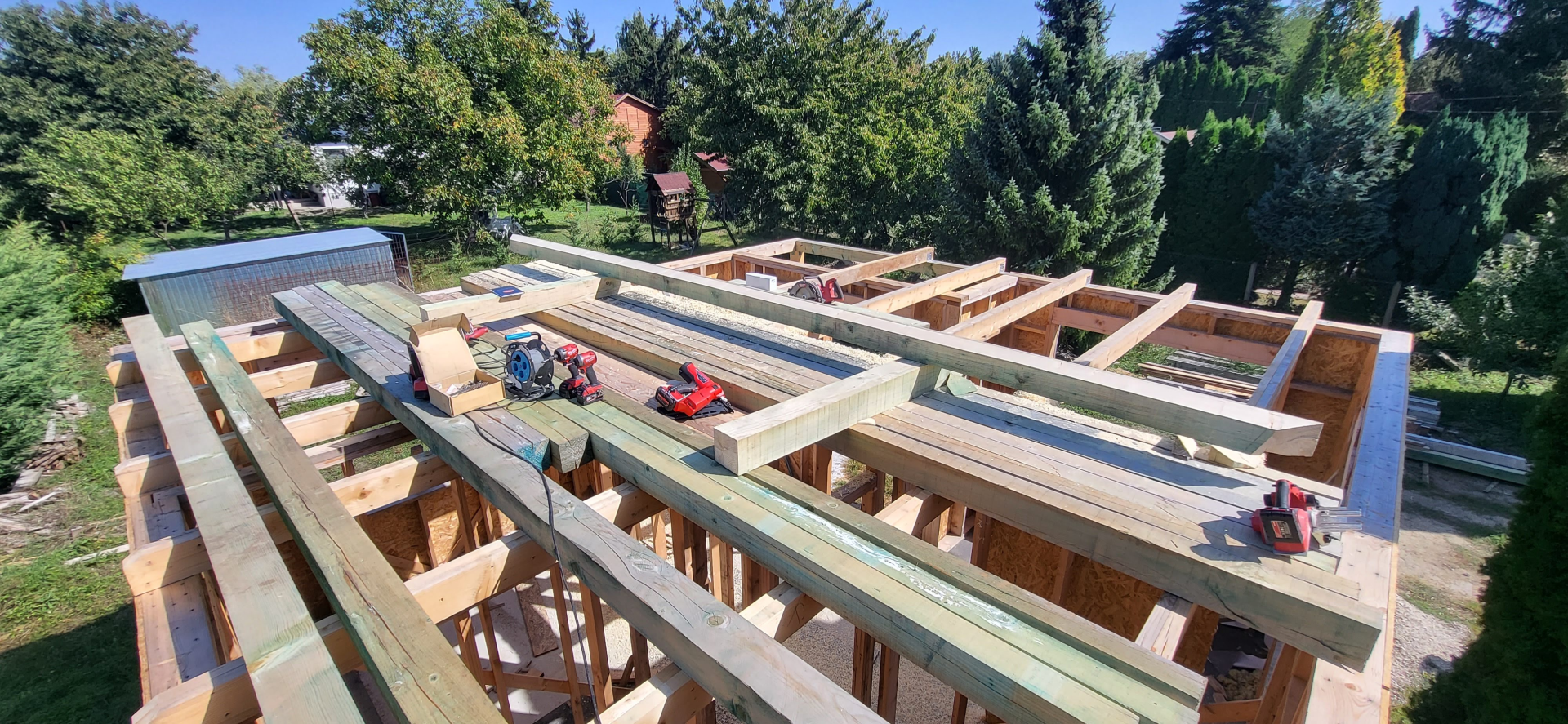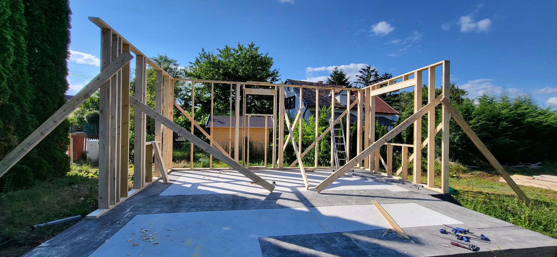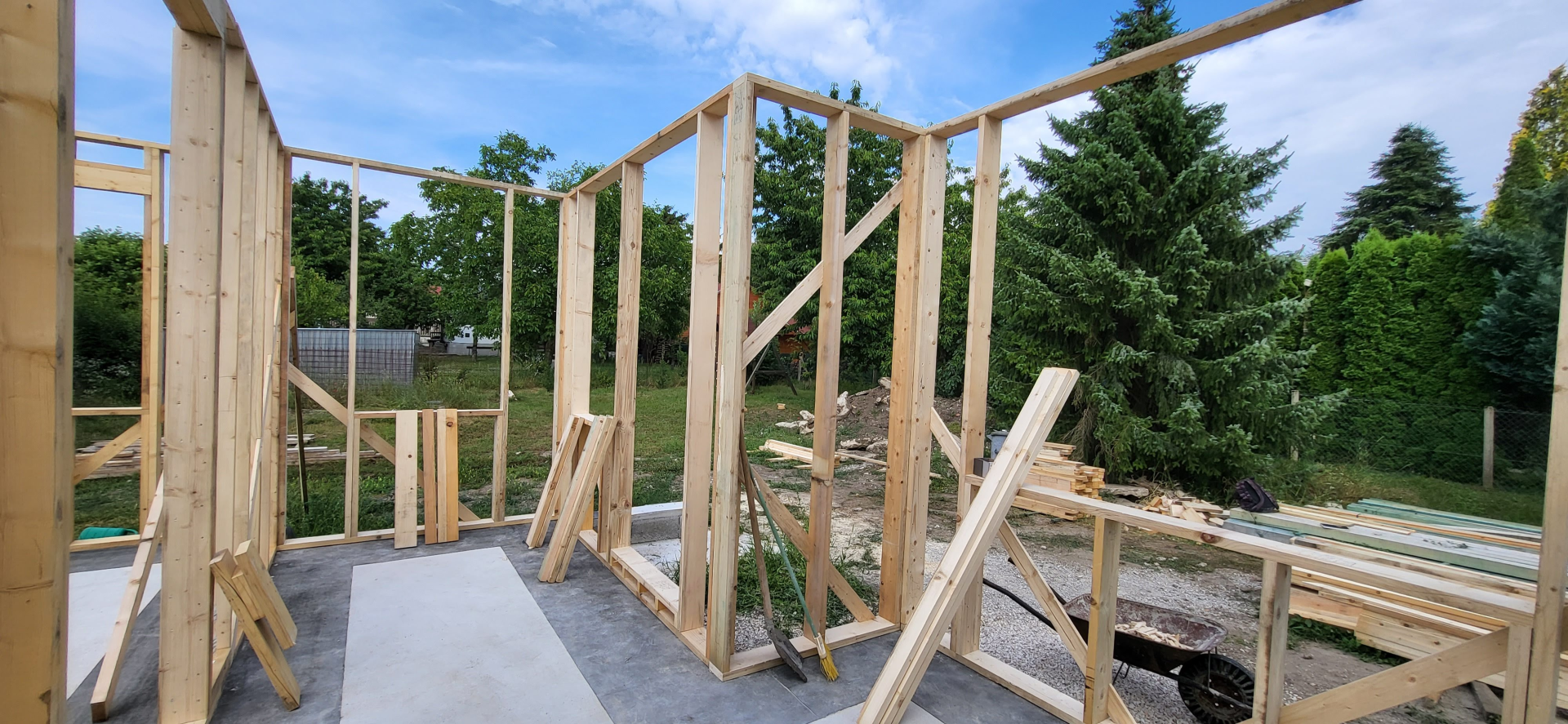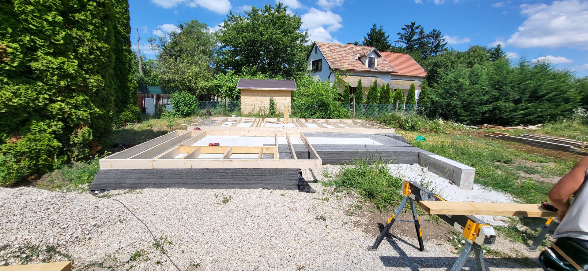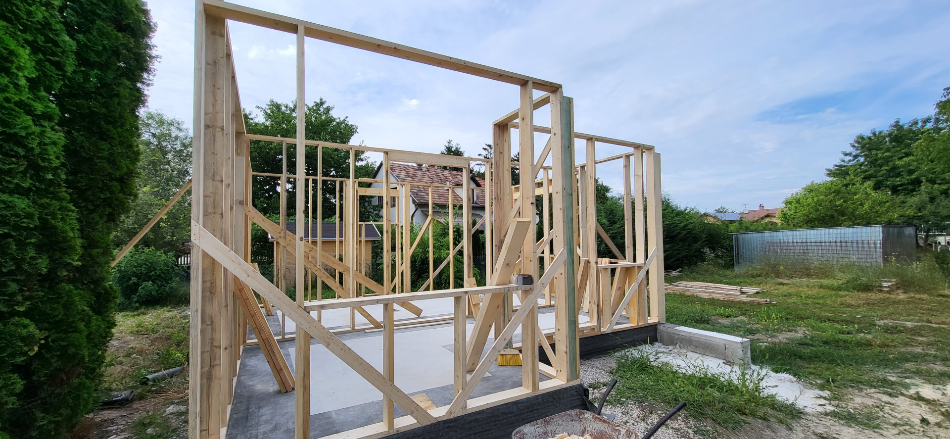 Építési kihívások: A munkálatok megkezdésekor rendelkezésünkre állt, egy korábbi kivitelező által készített beton alap. Első tervezett feladatunk a már elkészült alap kiegészítése volt. Mivel a korábban készült alapnál kisebb házat kért a megrendelő, így egy plusz sáv vált szükségessé. A bontási munkálatok megkezdésekor tapasztaltak alapján kértünk egy statikai szakvéleményt, amely megállapította, hogy a meglévő alap kivitelezése nem szakszerűen történt, javításra nincs mód, így sajnos azt el kell bontani. Az alap bontásakor került feltárásra a területen korábban állt ház alapteste, illetve egy pince is. A kitermelését követően egy méretes kráter alakult ki a területen. Annak érdekében, hogy az új alapot megfelelően tömörített földréteg támassza, úgy döntöttünk, hogy a sávalap egy részét zsaluzással készítjük el, és a száradást követően töltjük vissza, és tömörítjük a szükséges földet. A munkálatokról készült képek lent láthatóak.