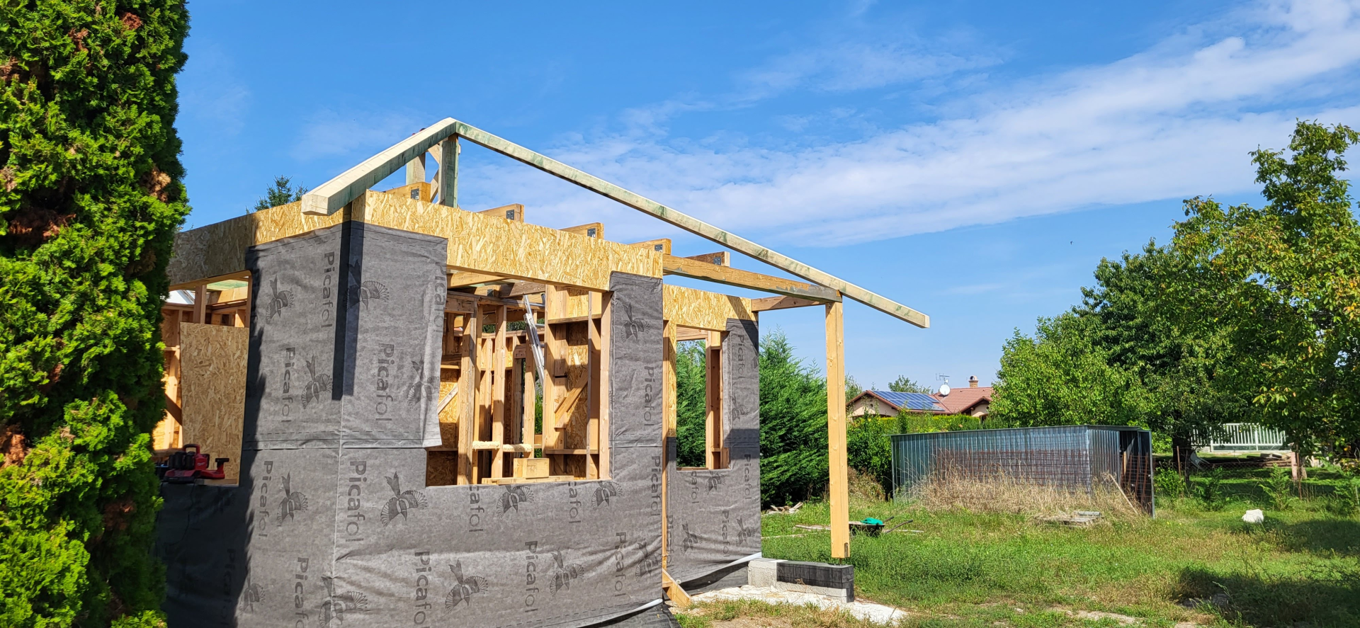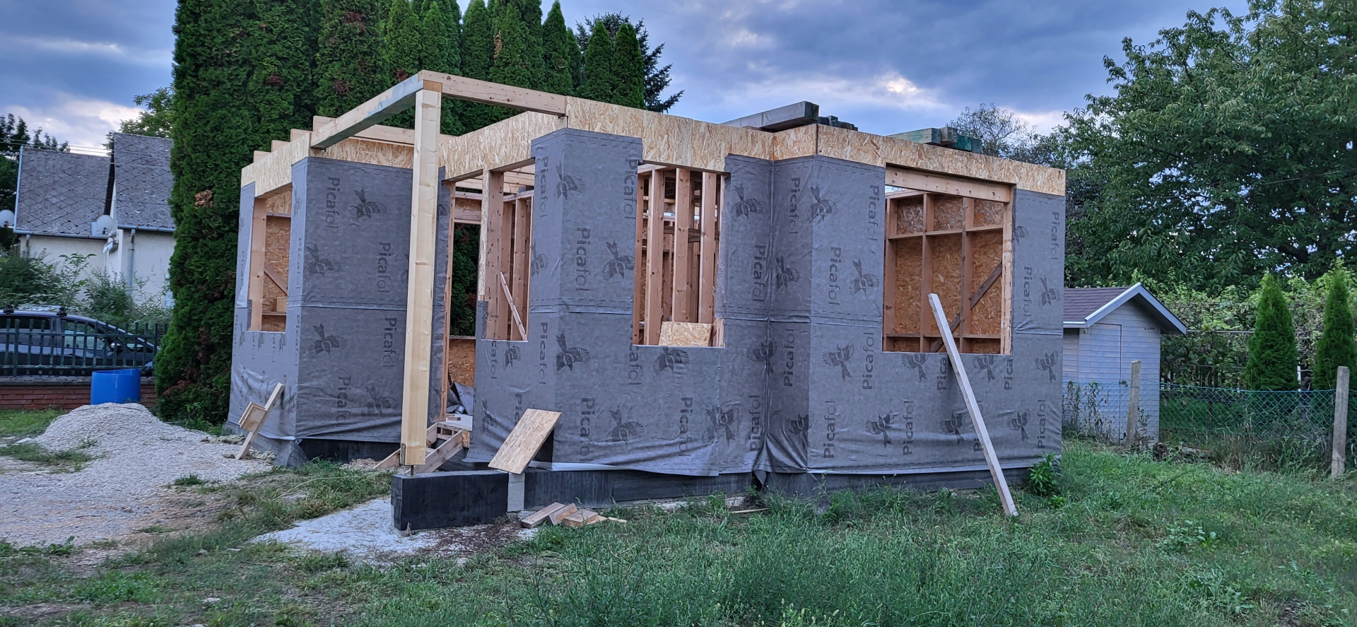 Balatonalmádiban (Aligán) jelenleg is építjük a képeken látható házat. Besorolása szerint lakóház, így minden jelenlegi energetikai, és egyéb követelménynek megfelel. Tulajdonosa nyaralóként szeretné használni. Beton alapozást kapott, 2 sor zsalukő kiemeléssel. Aljzat szigetelése 12 cm lépésálló EPS. Födéme 30, falai 15 cm szálas szigetelést kaptak+ 15 cm homlokzati EPS-t.