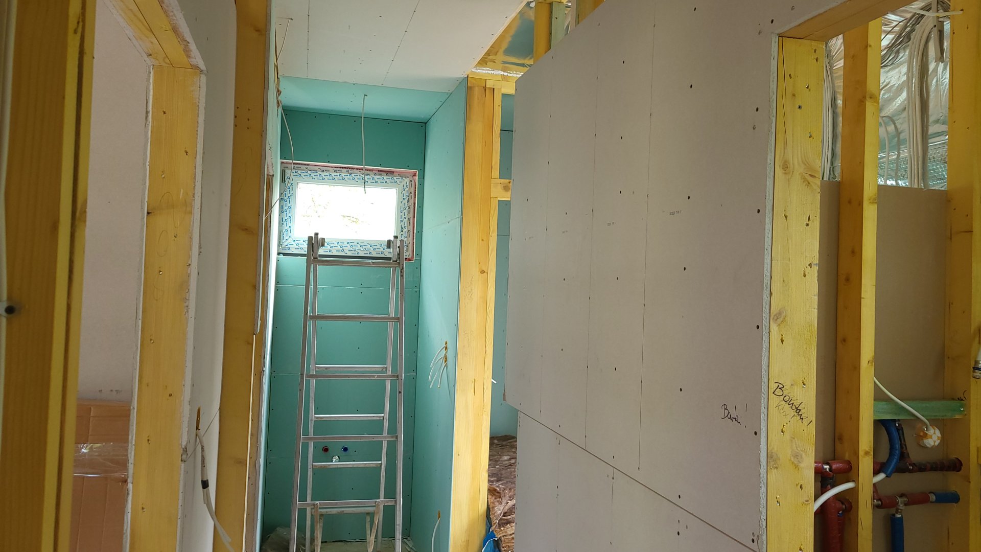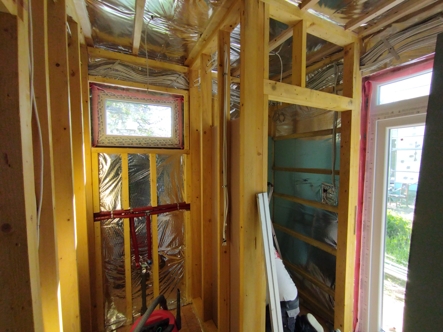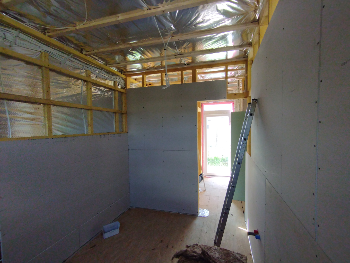 Belső terei gipszkarton falakat és mennyezetet kaptak, fehér színben, míg homlokzati burkolata trapézlemez. Standard méretű, fehér műanyag nyílászárókkal ellátott.