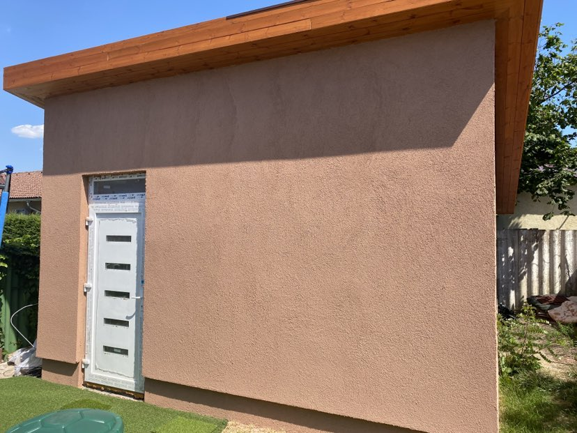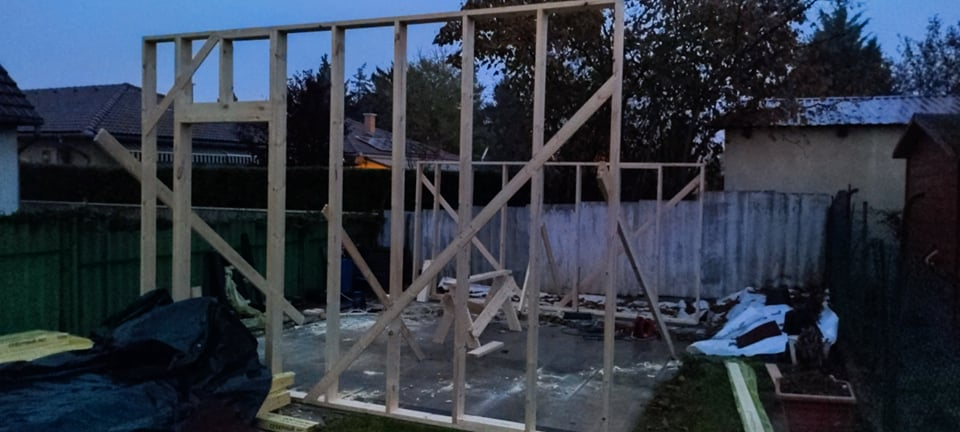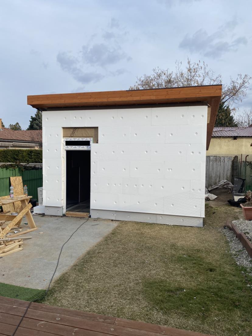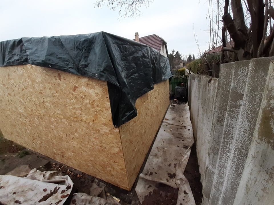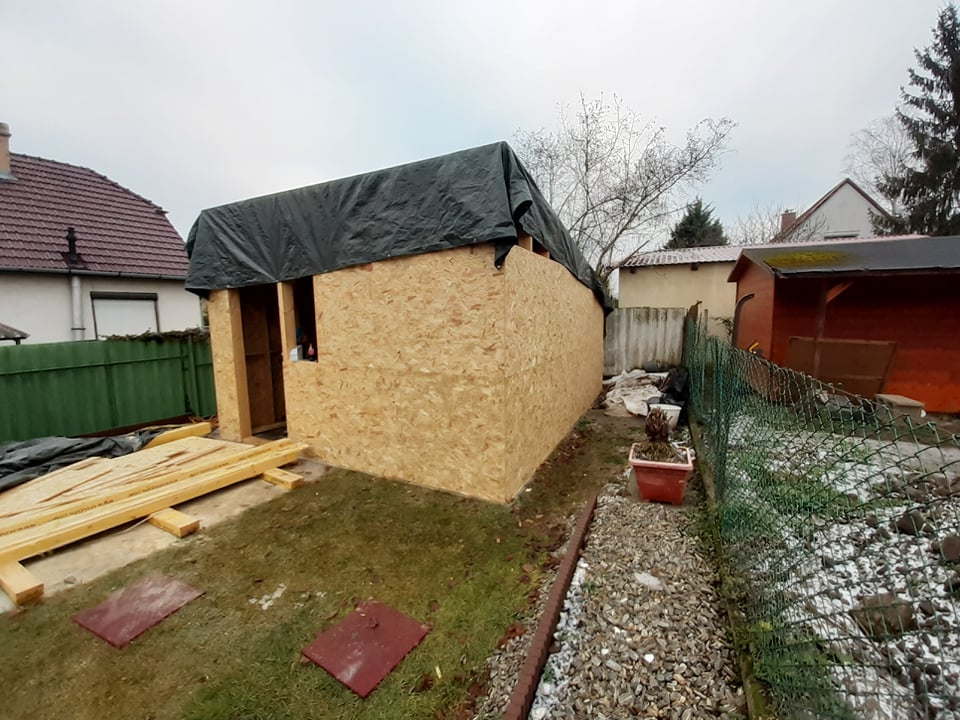 Pest vármegyében, Dunakeszin építettük ezt a hagyományos megjelenésű, féltetős melléképületet. A ház beton alapja már korábban elkészült, azzal nekünk - a vízszigetelés kivételével - nem volt feladatunk. Funkciója miatt belül a tér osztatlan, egyetlen nyílászárója a bejárati ajtó.