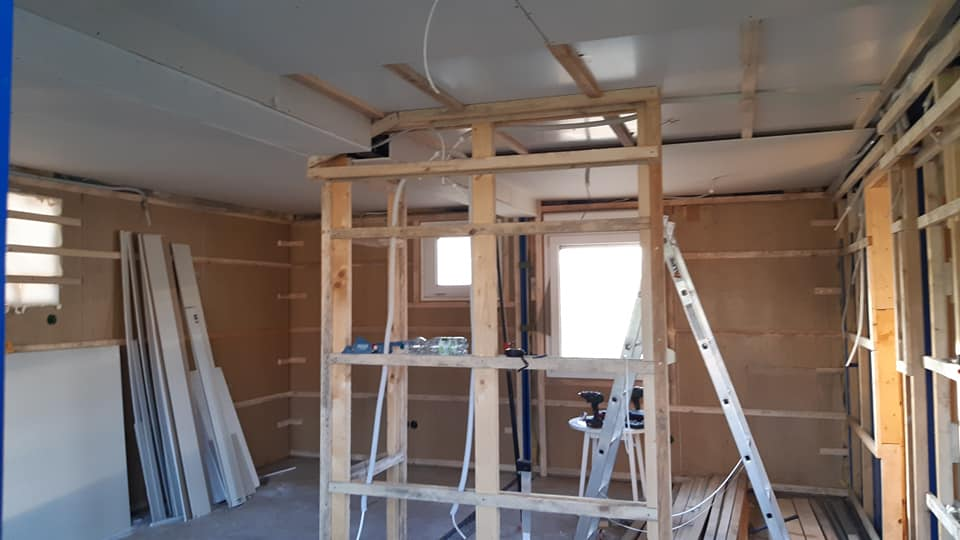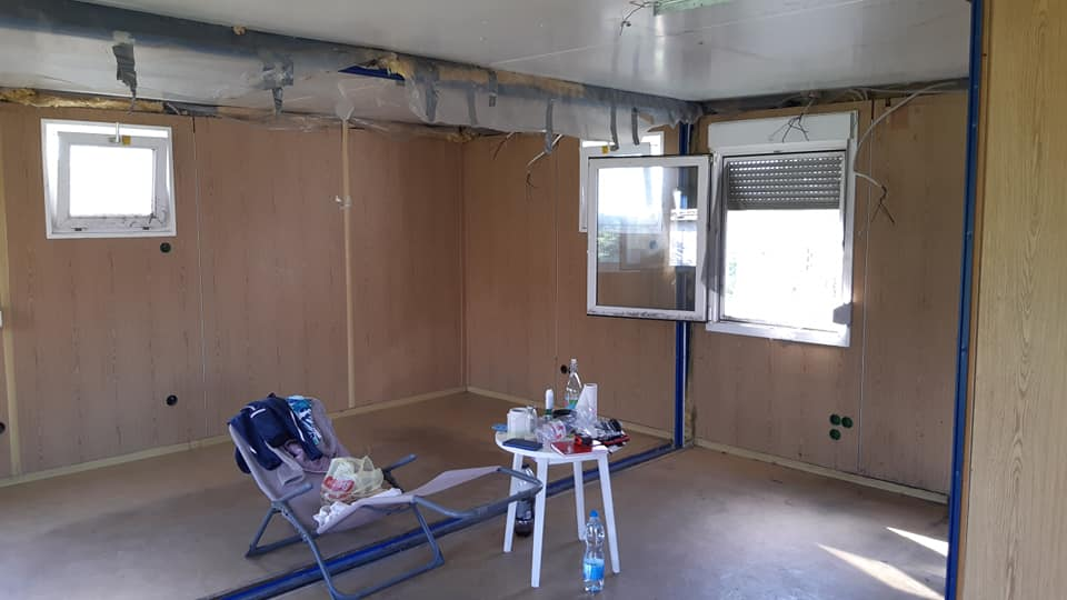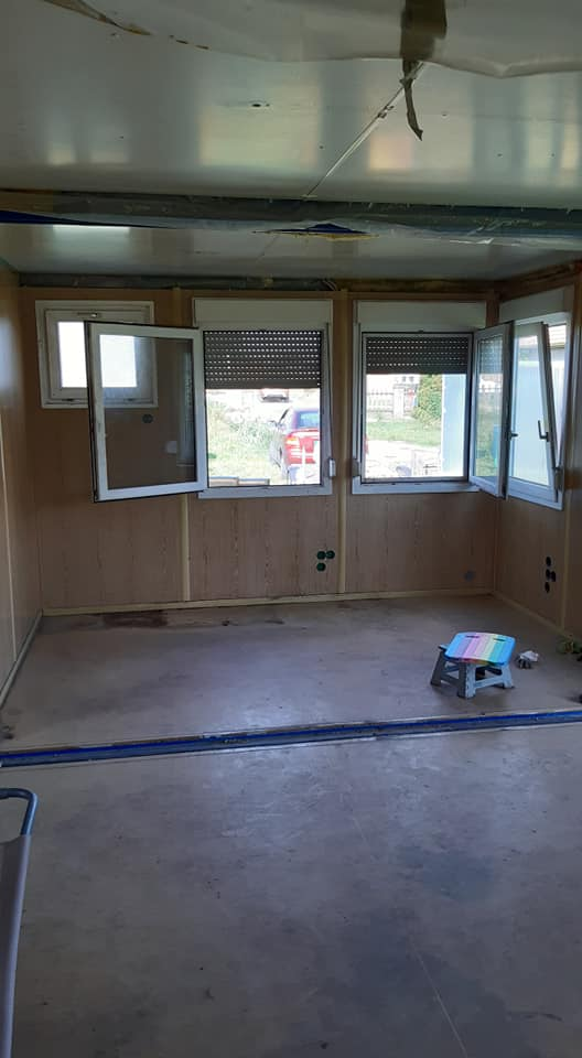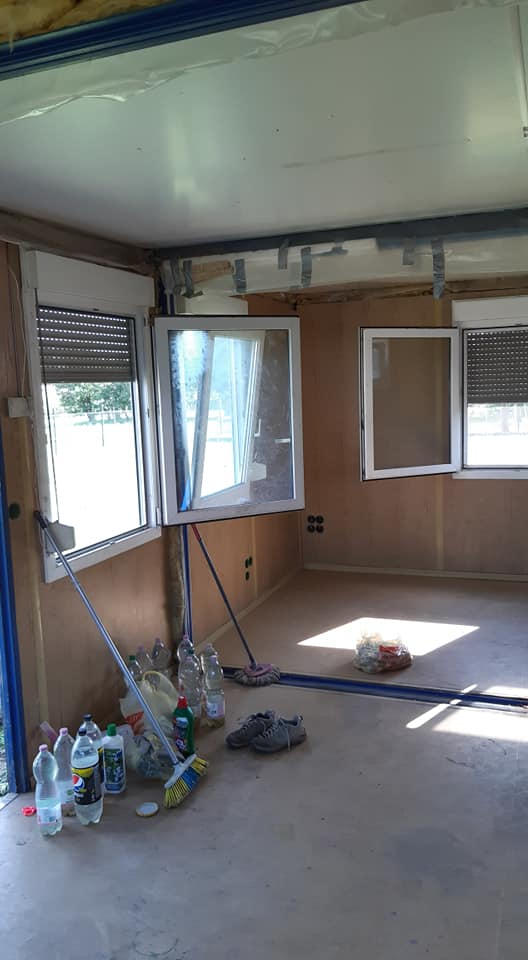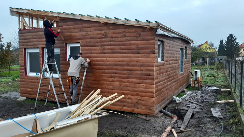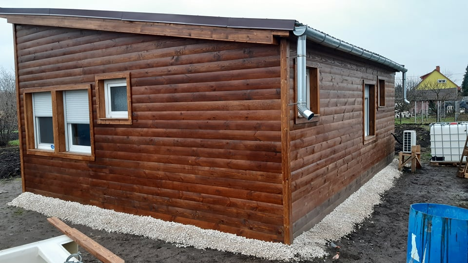 Pusztaszabolcson alakítottunk át 3 db irodakonténert, lakható házzá. Besorolása szerint melléképület, ez visszaköszön a relatíve alacsony építési költségben is. Az épület, megrendelőnk igénye szerint egy nagybb nappali-konyha-étkező térből, egy hálóból, és egy fürdőszobából áll. Szigetelése a konténerek gyári szigetelésén felül+10 cm kívül, és 20 cm a födémben. Fűtését és hűtését egy db hőszivattyús klíma biztosítja.