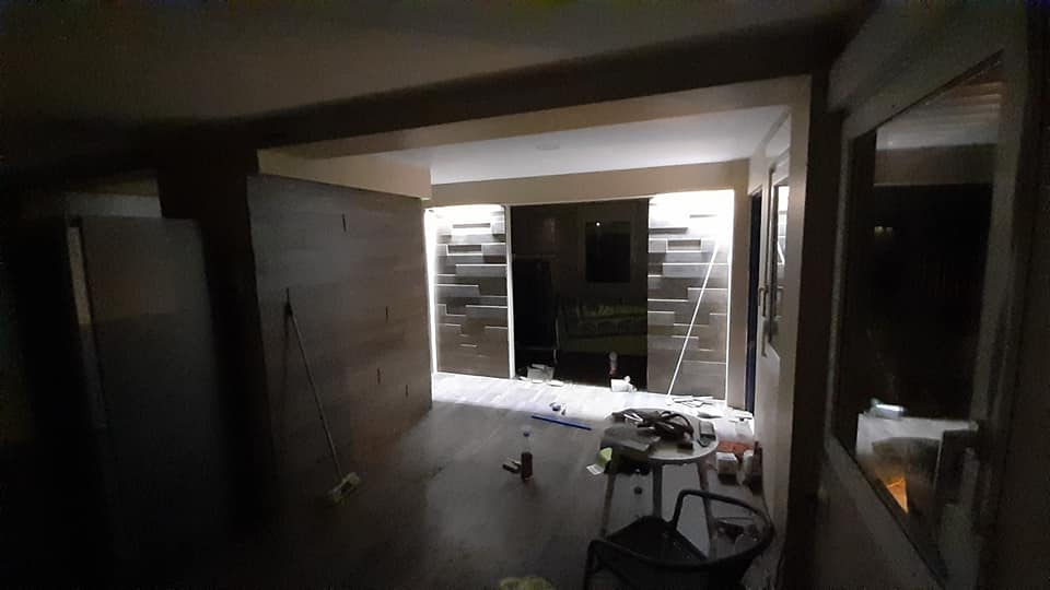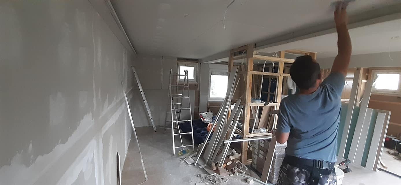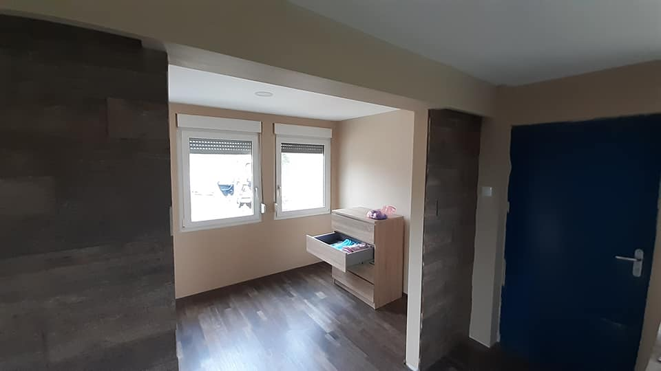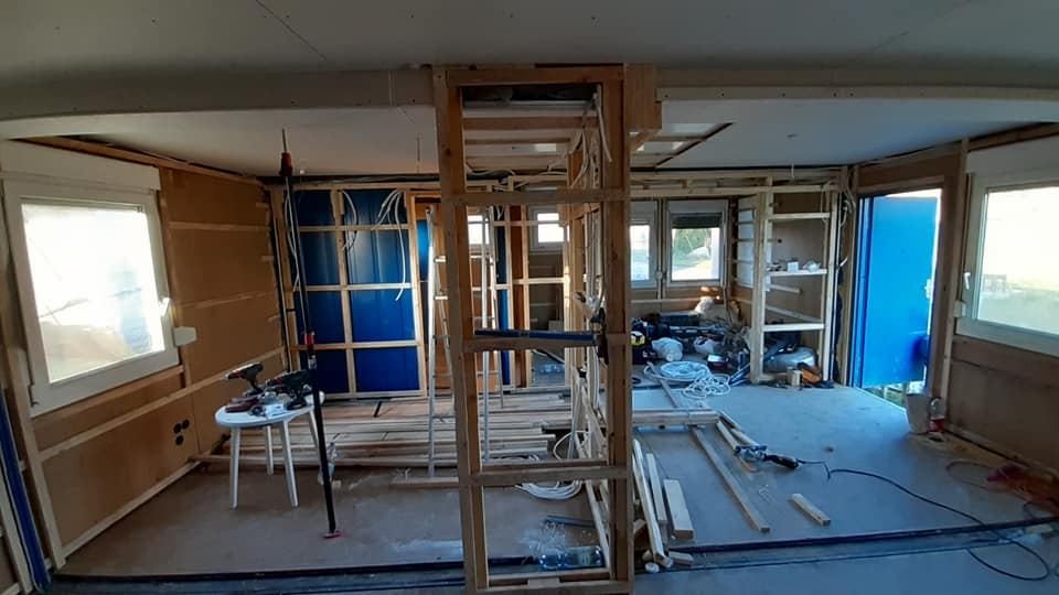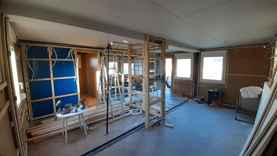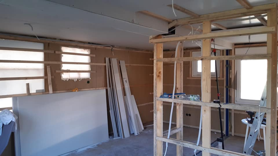 Pusztaszabolcson alakítottunk át 3 db irodakonténert, lakható házzá. Besorolása szerint melléképület, ez visszaköszön a relatíve alacsony építési költségben is. Az épület, megrendelőnk igénye szerint egy nagybb nappali-konyha-étkező térből, egy hálóból, és egy fürdőszobából áll. Szigetelése a konténerek gyári szigetelésén felül+10 cm kívül, és 20 cm a födémben. Fűtését és hűtését egy db hőszivattyús klíma biztosítja.