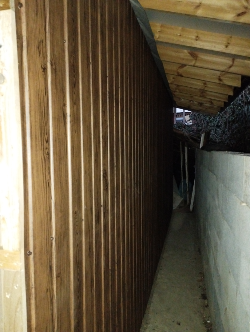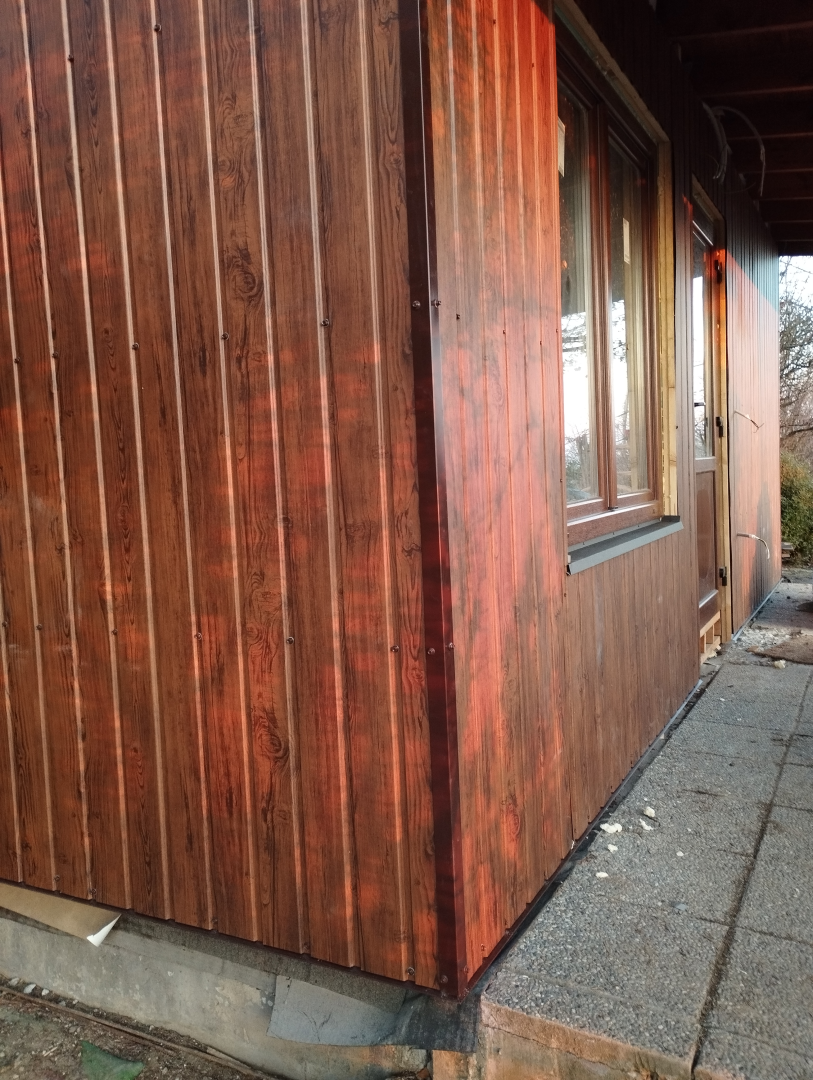 Belső terei gipszkarton falakat kaptak, míg homlokzati burkolata fa mintázatú, 8mm bordamagasságú trapézlemez.Cserepeslemez fedést kapott, csüngő ereszcsatornával.