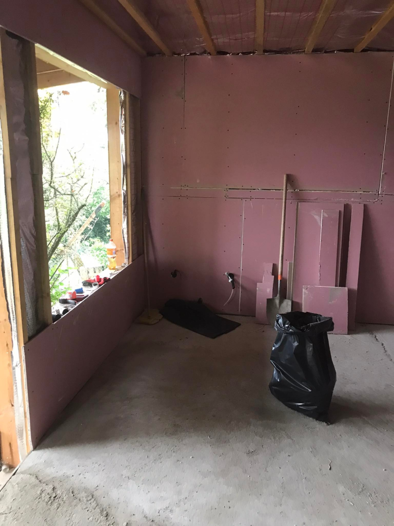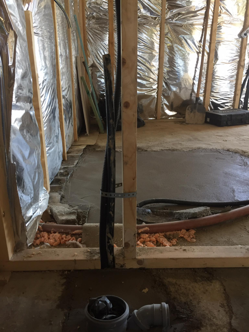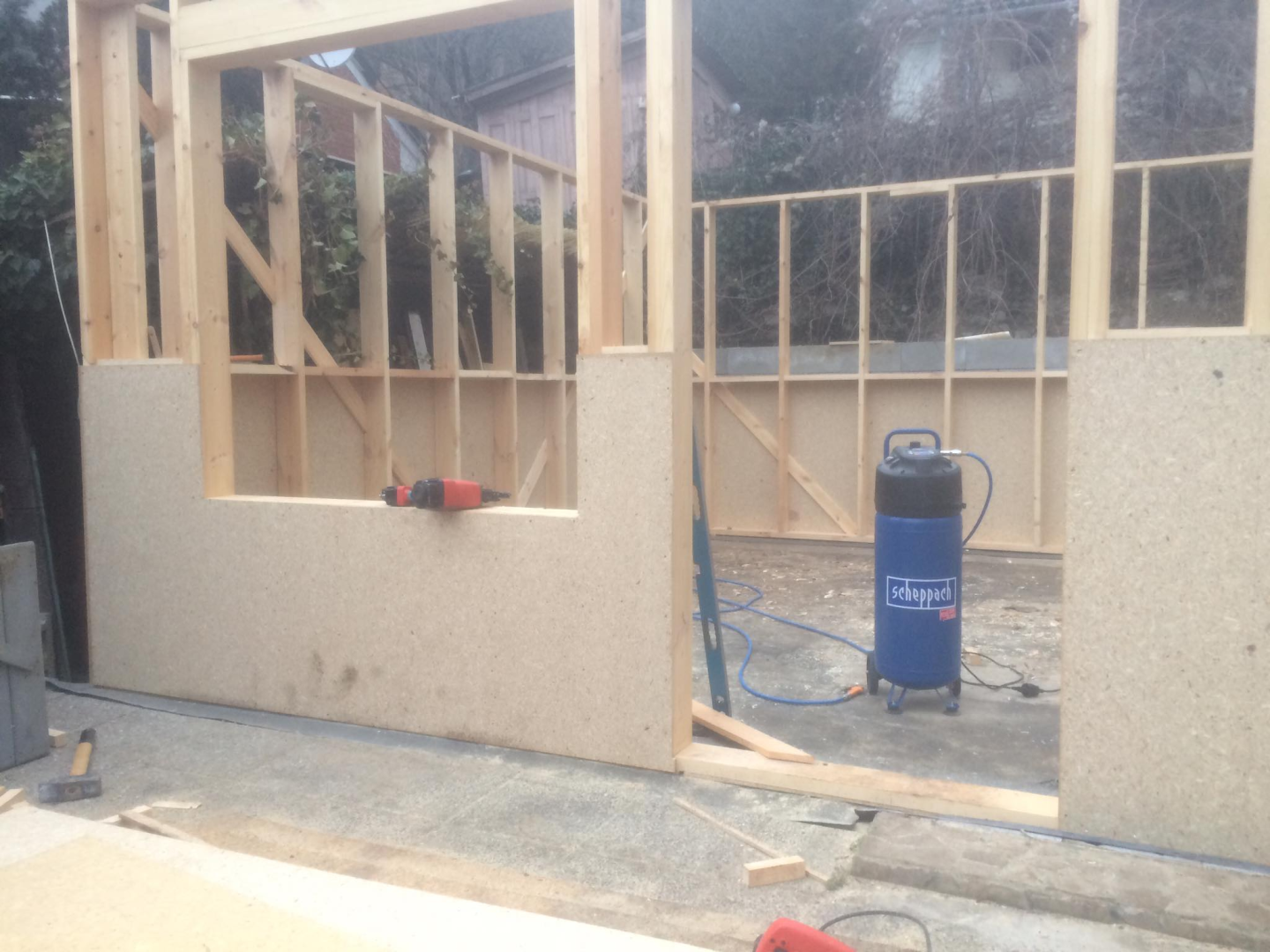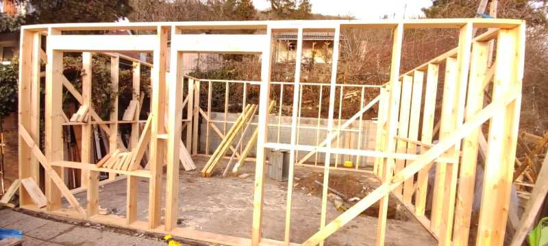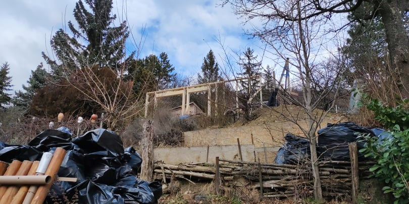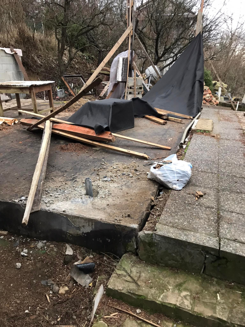Kihívásokkal teli munka várt ránk Verőcén. A helyszínen állt egy régi épület, amit lebontottunk, és annak a beton alapjára terveztük az új épületet. A buntást követően derült fény a korábbi alap nem megfelelő minőségére, ami már a kezdésnél extra munkát jelentett. A meglévő betont, acél talajcsavarok segítségével megerősítettük, majd ezt követően a ház mögötti domboldalt egy támfallal láttuk el. A támfal és a régi alap közötti részt betonoztuk, így megnövelve a lehetséges alapterületet.