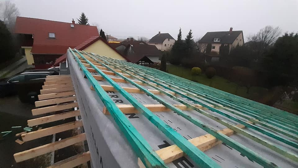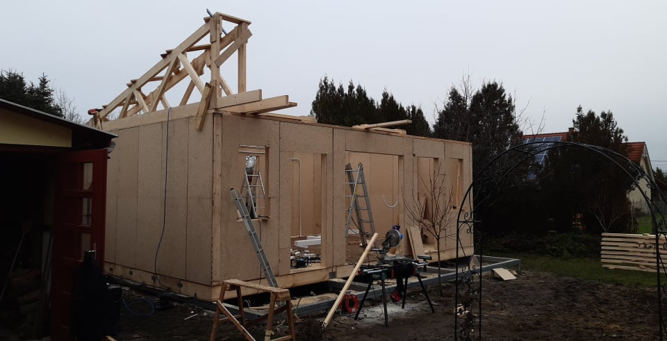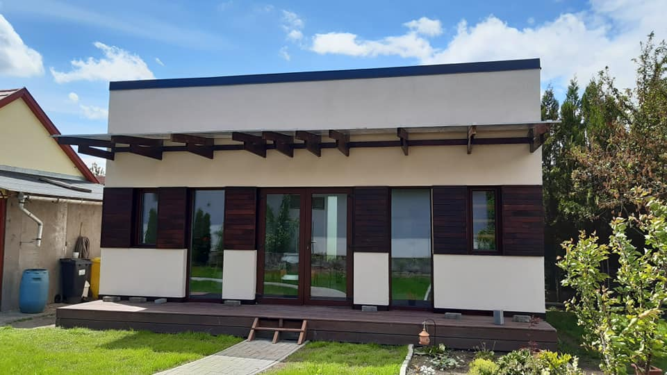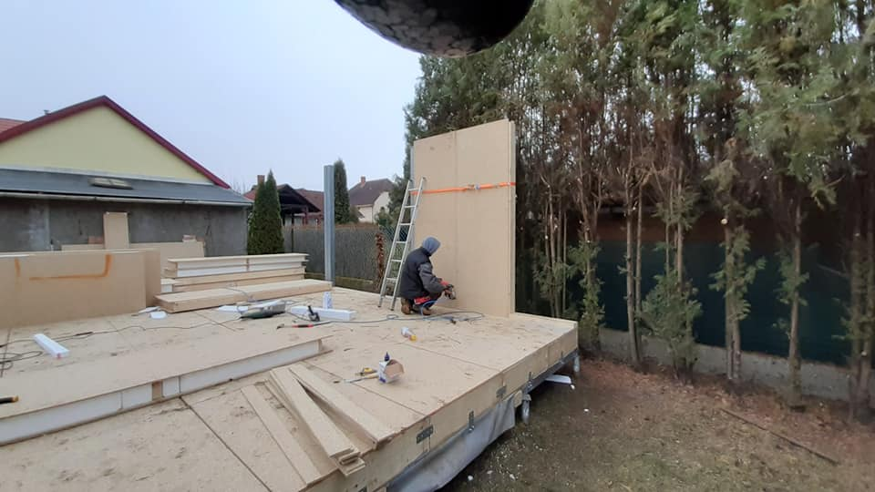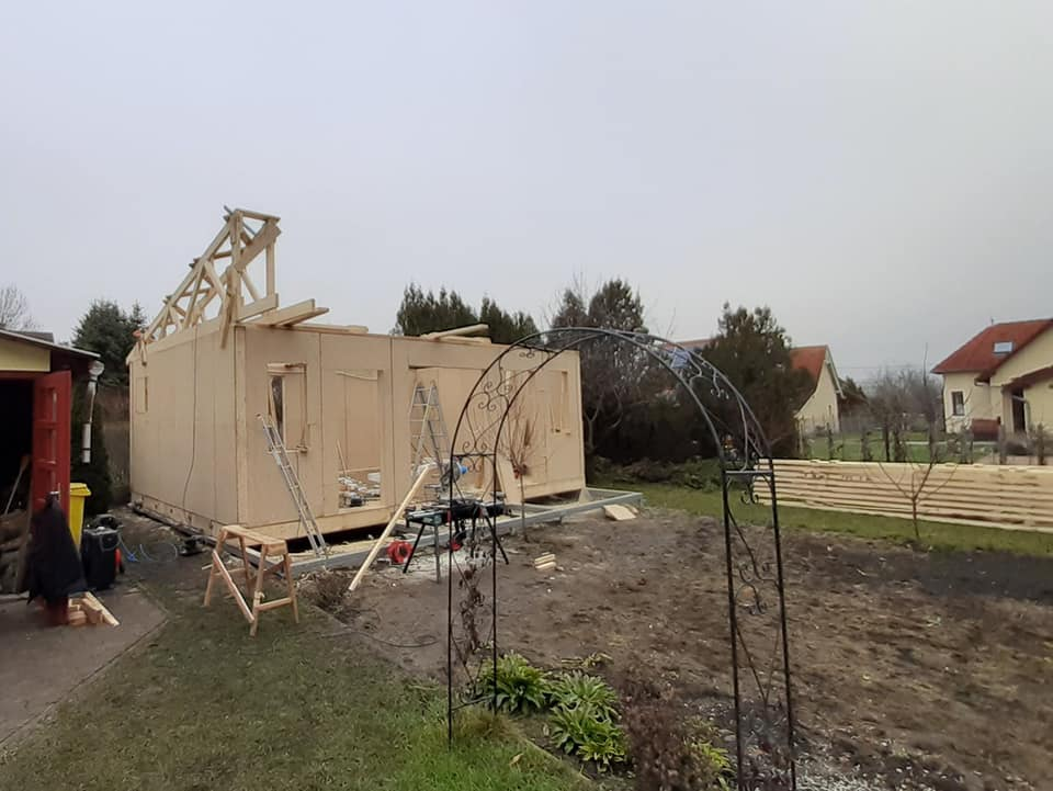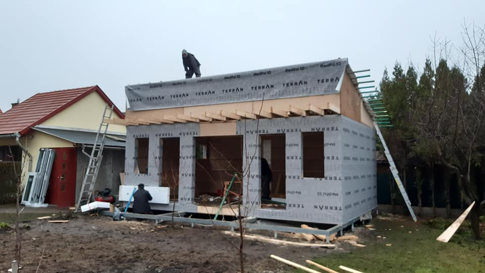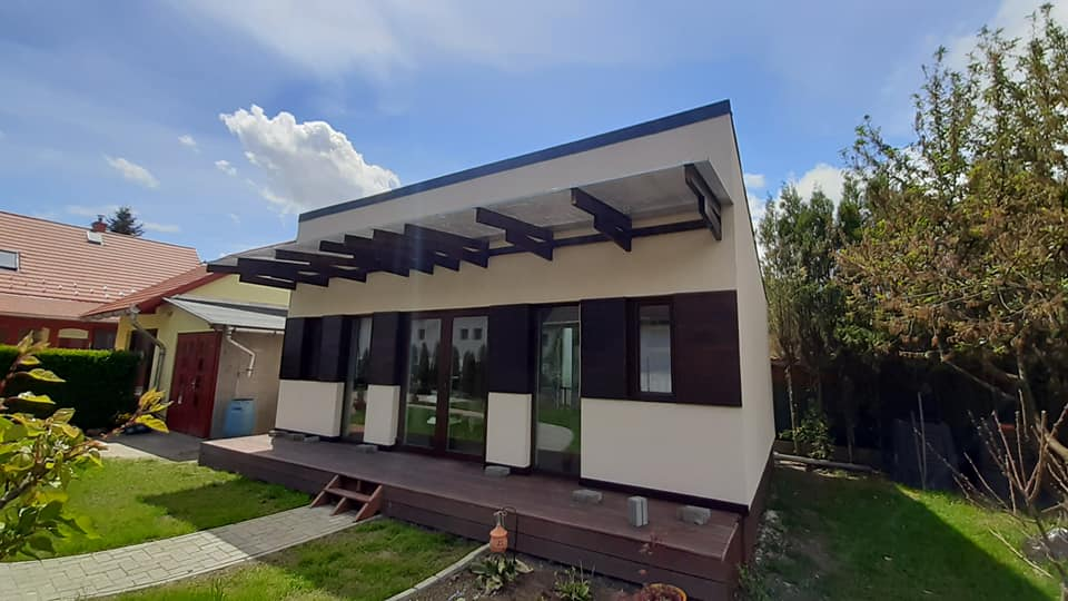 Egyedi megoldásai: A ház vázszerkezetét telephelyünkön készítettük el, majd teherautó szállította a helyszínre elemenként. A ház talajcsavarokra lett telepítve, horganyzott acél vázszerkezettel készült, előre gyártott pallóvázas fa szerkezettel. Tetőszerkezete rácsos tartós, födémgerendáinak túllógása képezi a függesztett teraszfedés tartóit. Cserepeslemez fedést kapott, csüngő ereszcsatornával.