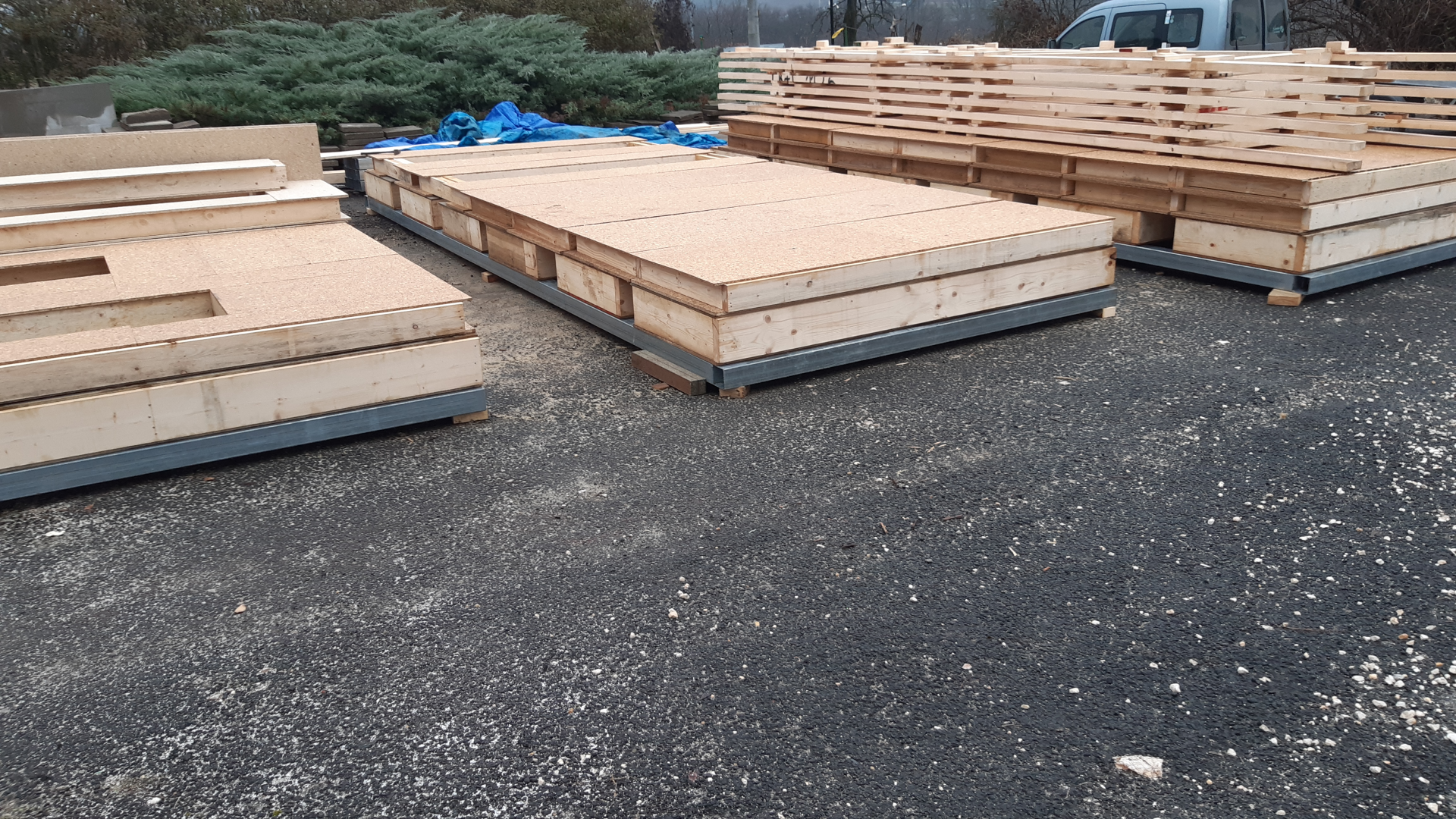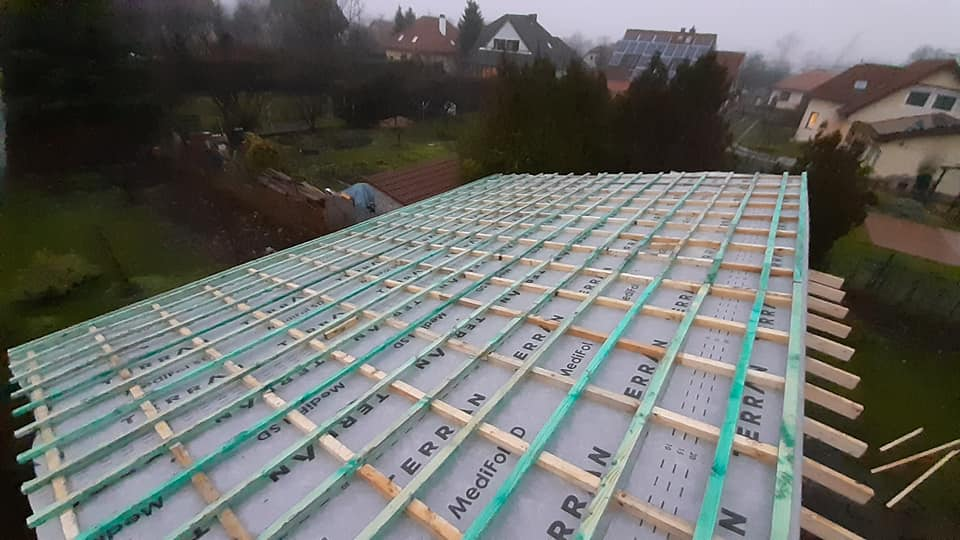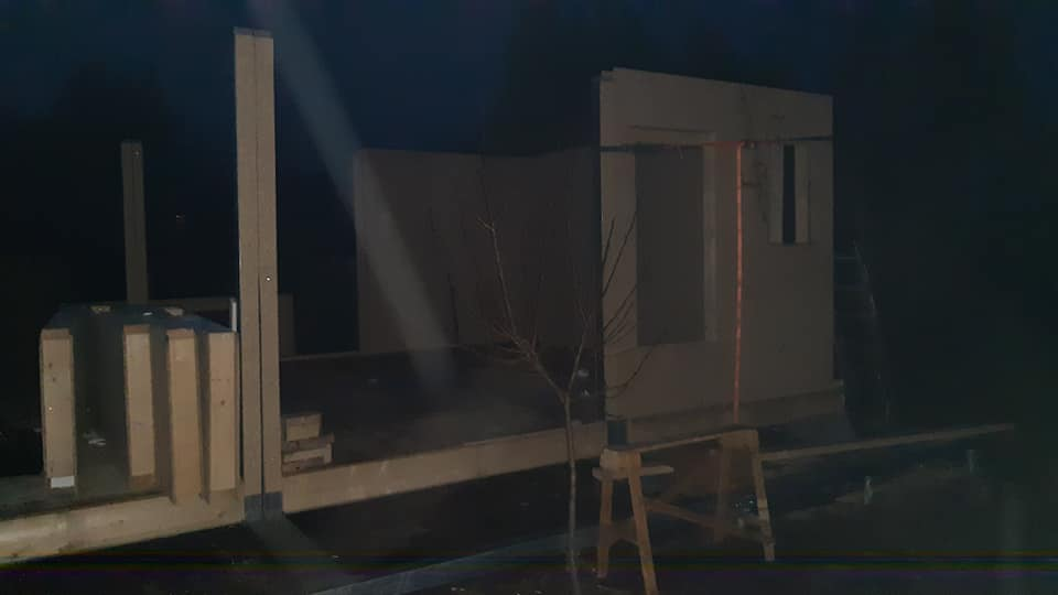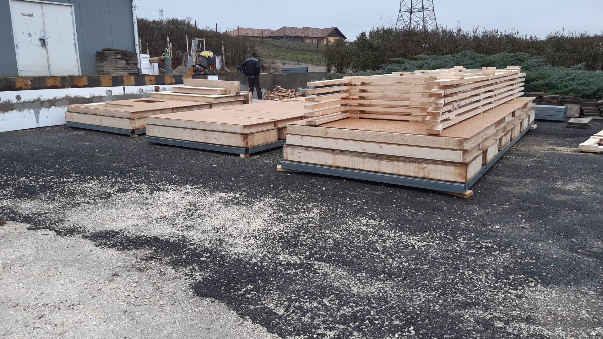 Egyedi megoldásai: A ház vázszerkezetét telephelyünkön készítettük el, majd teherautó szállította a helyszínre elemenként. A ház talajcsavarokra lett telepítve, horganyzott acél vázszerkezettel készült, előre gyártott pallóvázas fa szerkezettel. Tetőszerkezete rácsos tartós, födémgerendáinak túllógása képezi a függesztett teraszfedés tartóit. Cserepeslemez fedést kapott, csüngő ereszcsatornával.