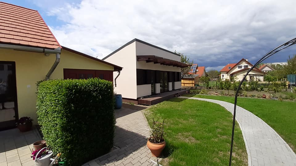 Veszprémben építettük ezt a keramikus műhelyként funkcionáló épületet. Besorolása szerint melléképület, ez visszaköszön a relatíve alacsony építési költségben is. Az épület, megrendelőnk igénye szerint egy nagy térből, és egy mosdóból áll. A nagy felületű ablakok biztosítják a megfelelő benapozottságot. Szigetelése 15 cm falszerkezeten belül+10 cm kívül. Fűtését és hűtését egy db hőszivattyús klíma biztosítja.