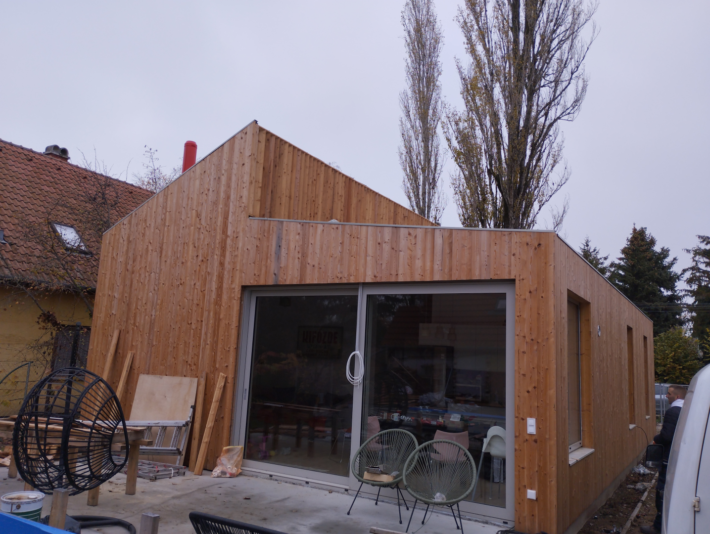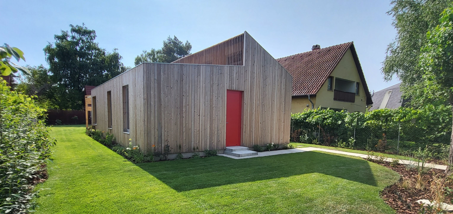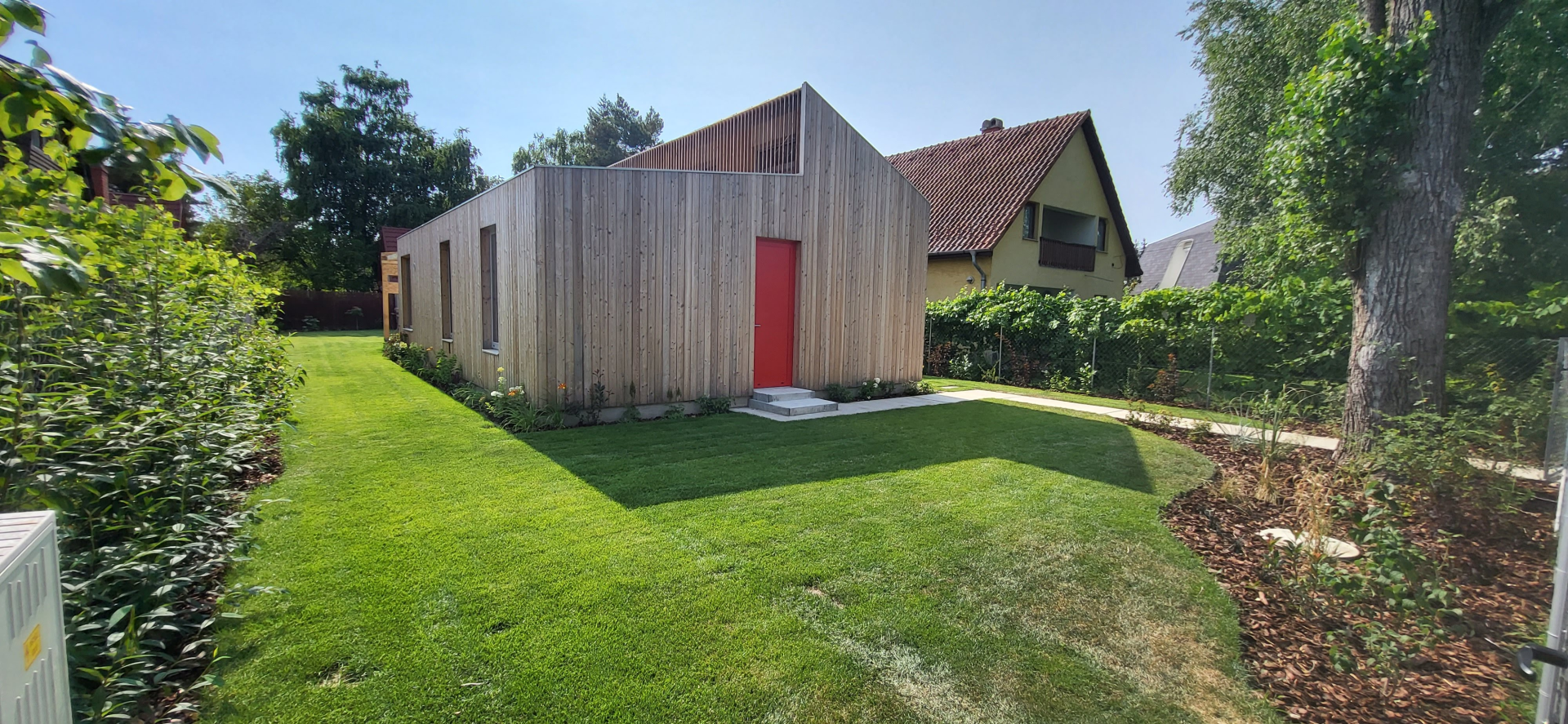 Belső terei gipszkarton falakat kaptak, fehér színben, míg homlokzati burkolata vörösfenyő. Egyedi színben és méretben készített, alumínium nyílászárókkal ellátott.