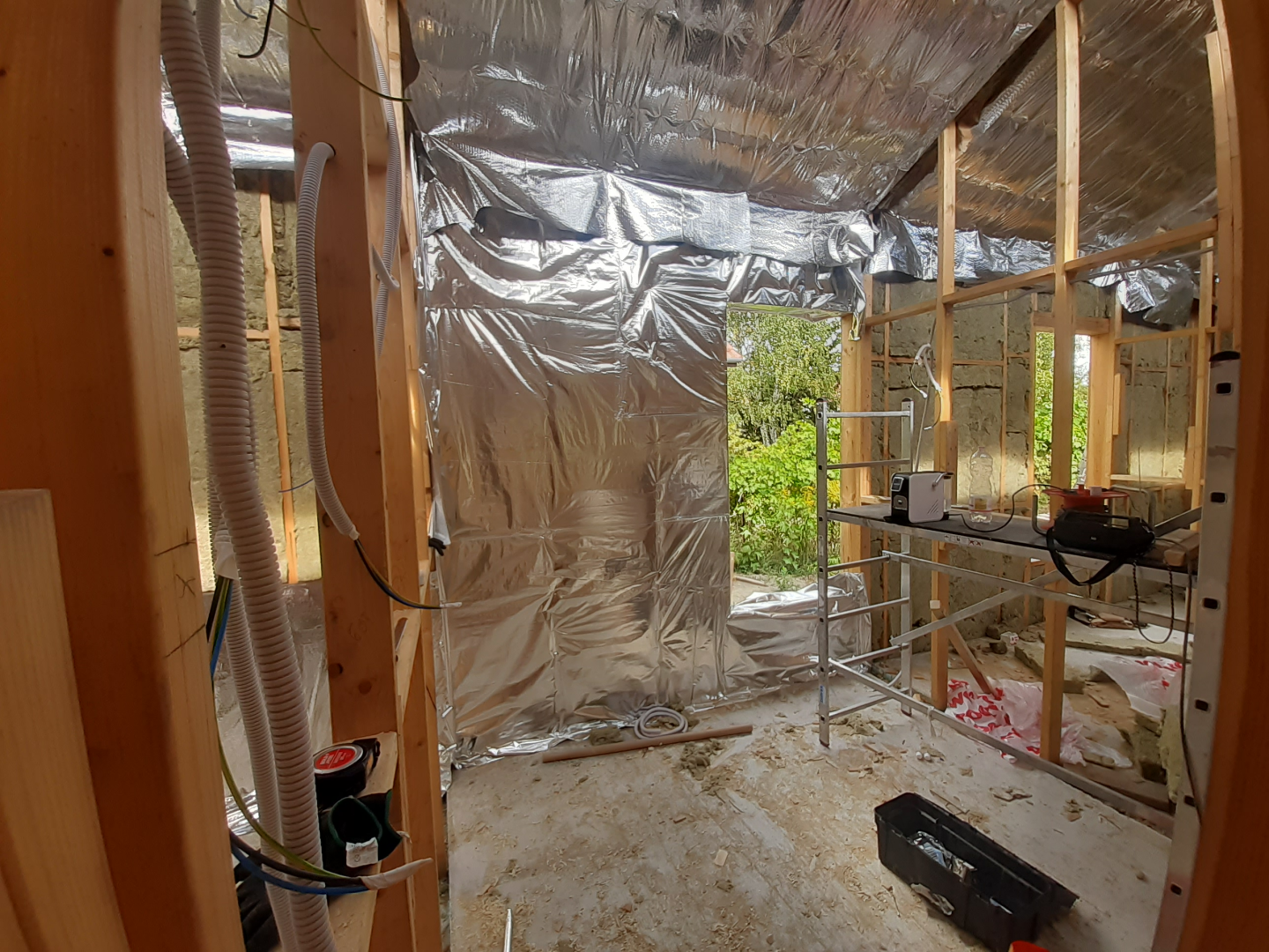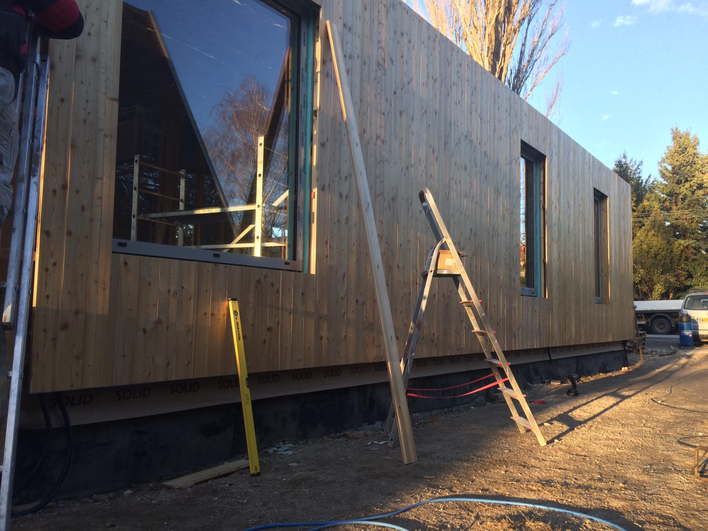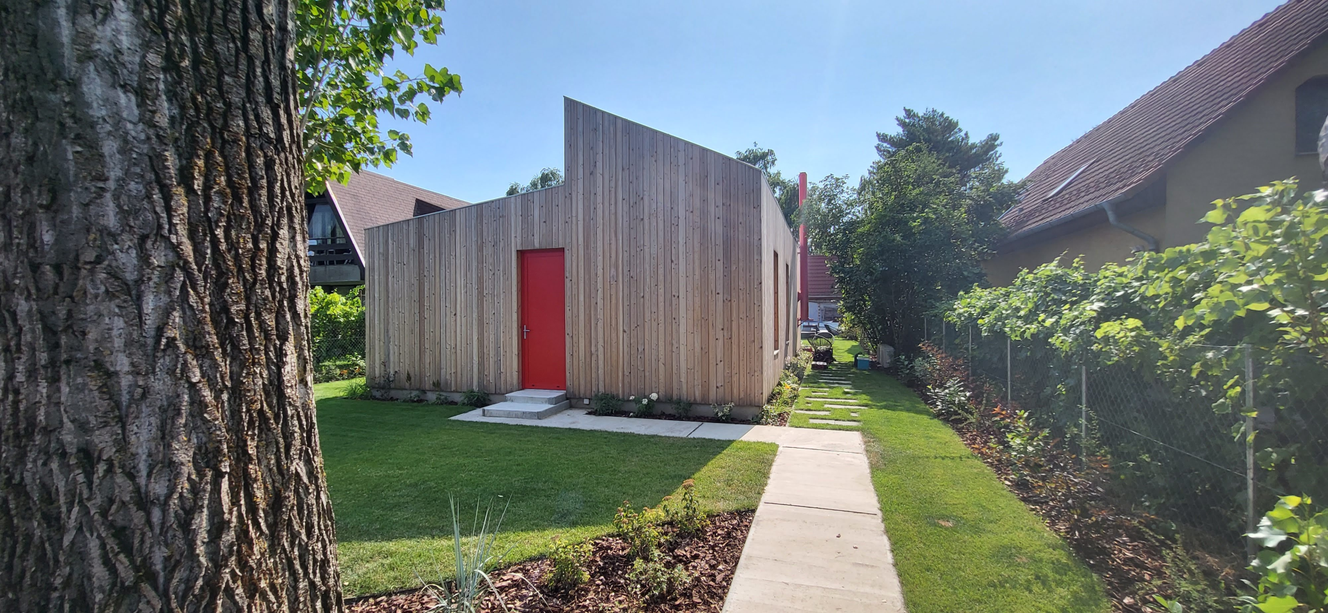 Belső terei gipszkarton falakat kaptak, fehér színben, míg homlokzati burkolata vörösfenyő. Egyedi színben és méretben készített, alumínium nyílászárókkal ellátott.