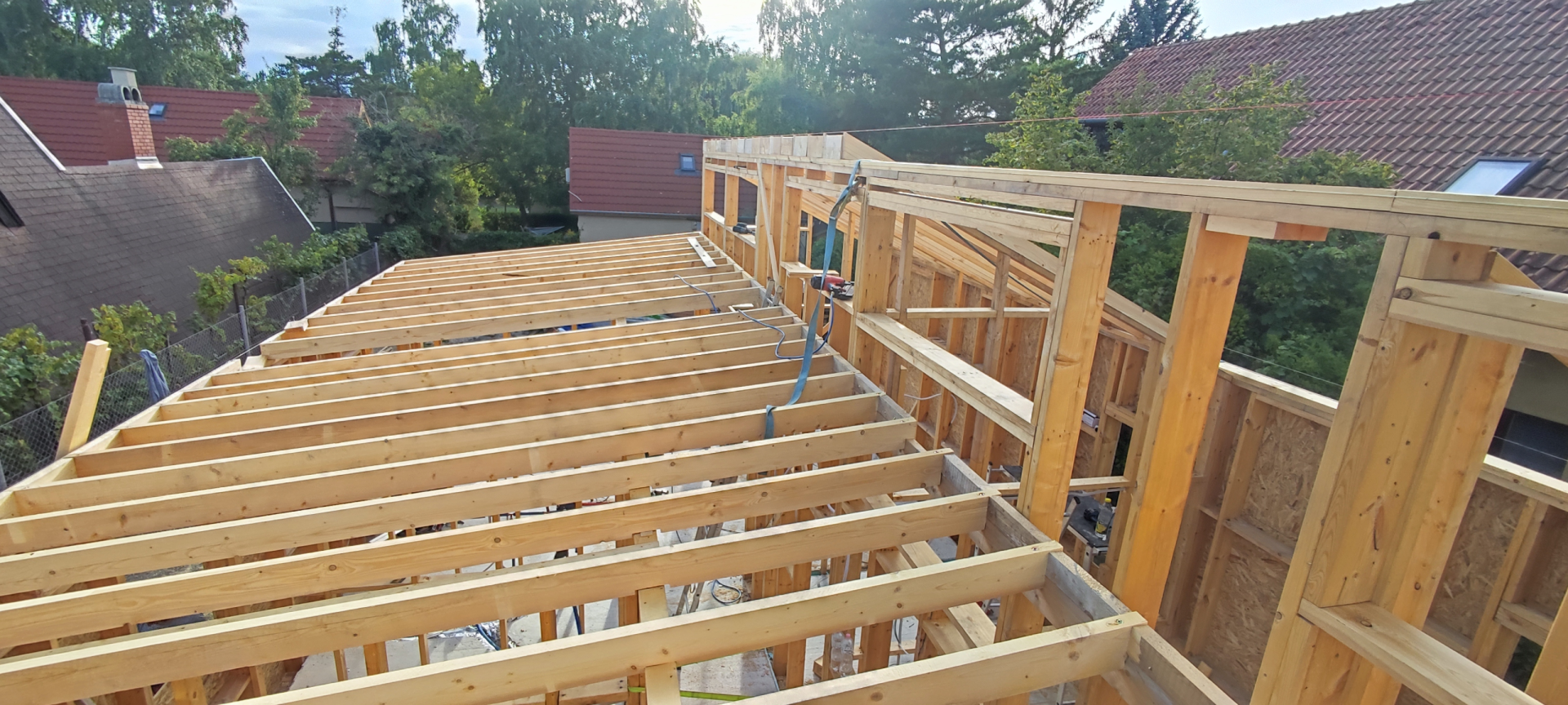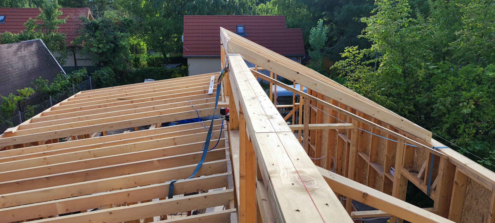Mennyezete követi a tető dőlésszögét, ami egyedi belső tereket eredményezett. A ház két tömege között magasság, és tető dőlésszög különbség van. Ebbe a függőleges falszakaszba kerültek nyílászárók, amik a szobák, és a nappali benapozttságát növelik. Egyedi parapetmagasságú ablakain rengeteg fény érkezik a helyiségekbe.